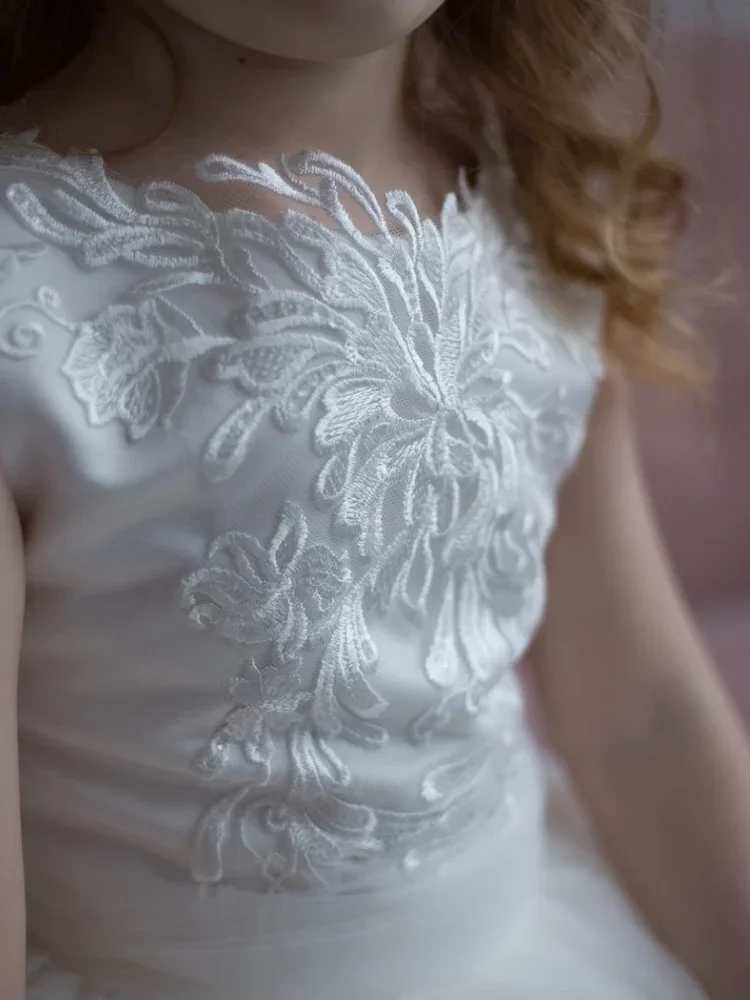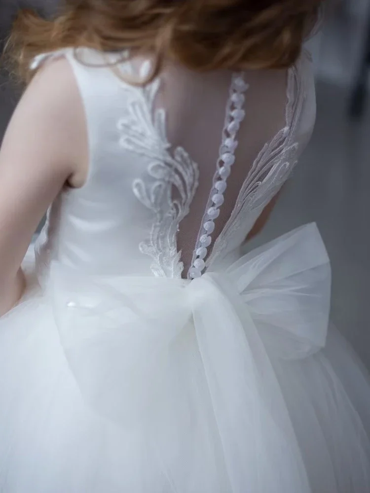 Weiße Tüll-Flory-Applikationen mit ärmelloser Schleife für Hochzeits-Geburtstags-Party-Kleider der Heiligen Kommunion