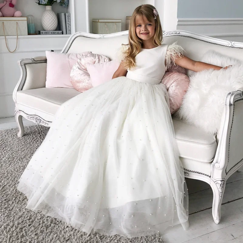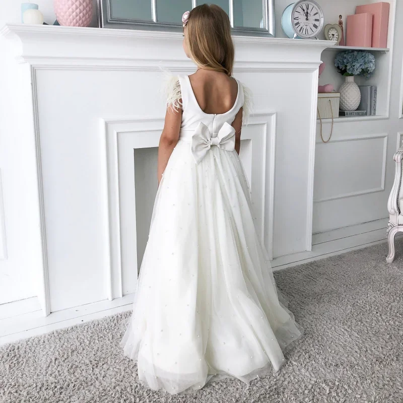 Weiß Tüll Perlen Mit Bogen Feder Ärmellos Für Hochzeit Geburtstag Party Heilige Kommunion Kleider Angepasst Blumen Mädchen Kleider