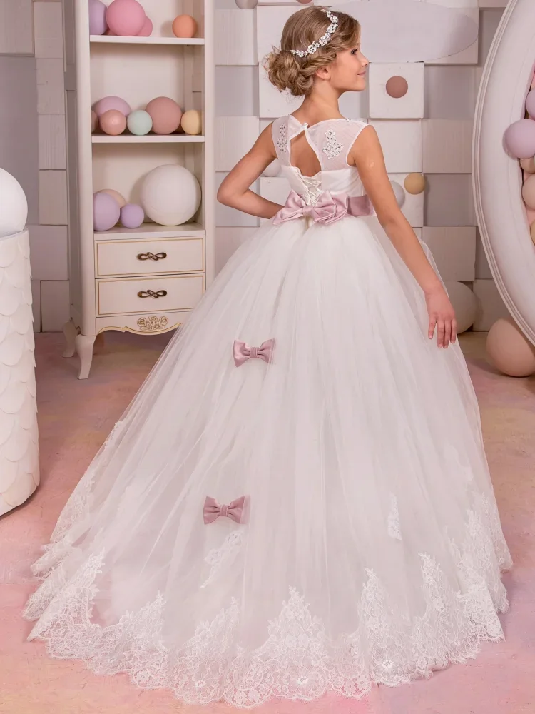 Mit rosa Schleife ärmellos für Hochzeit Geburtstag Party Bankett Kleider Blumenmädchen Kleider Weiß Tüll Diamant Spitze Applikationen
