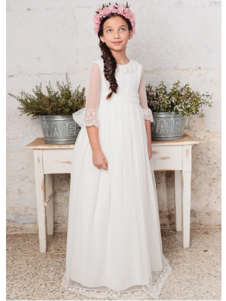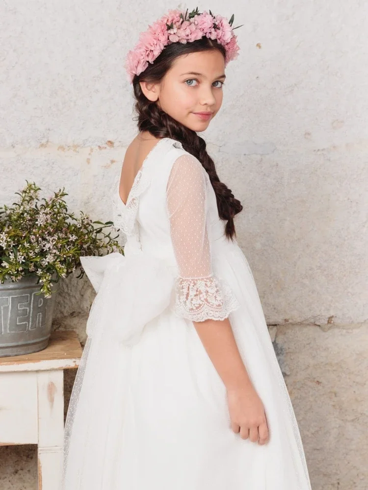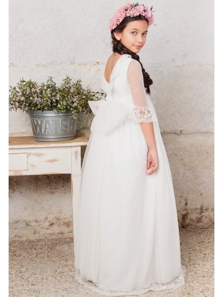 Mit weißer Schleife Halbarm für Hochzeit Geburtstag Heilige Kommunion Bankett Prinzessin Kleider Blumenmädchenkleider Weiße Spitzenapplikationen