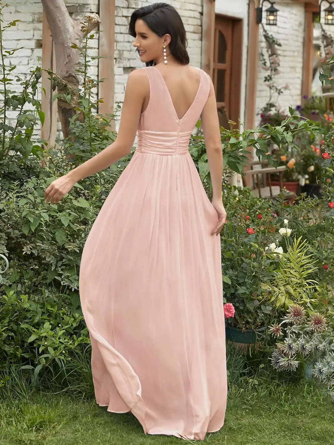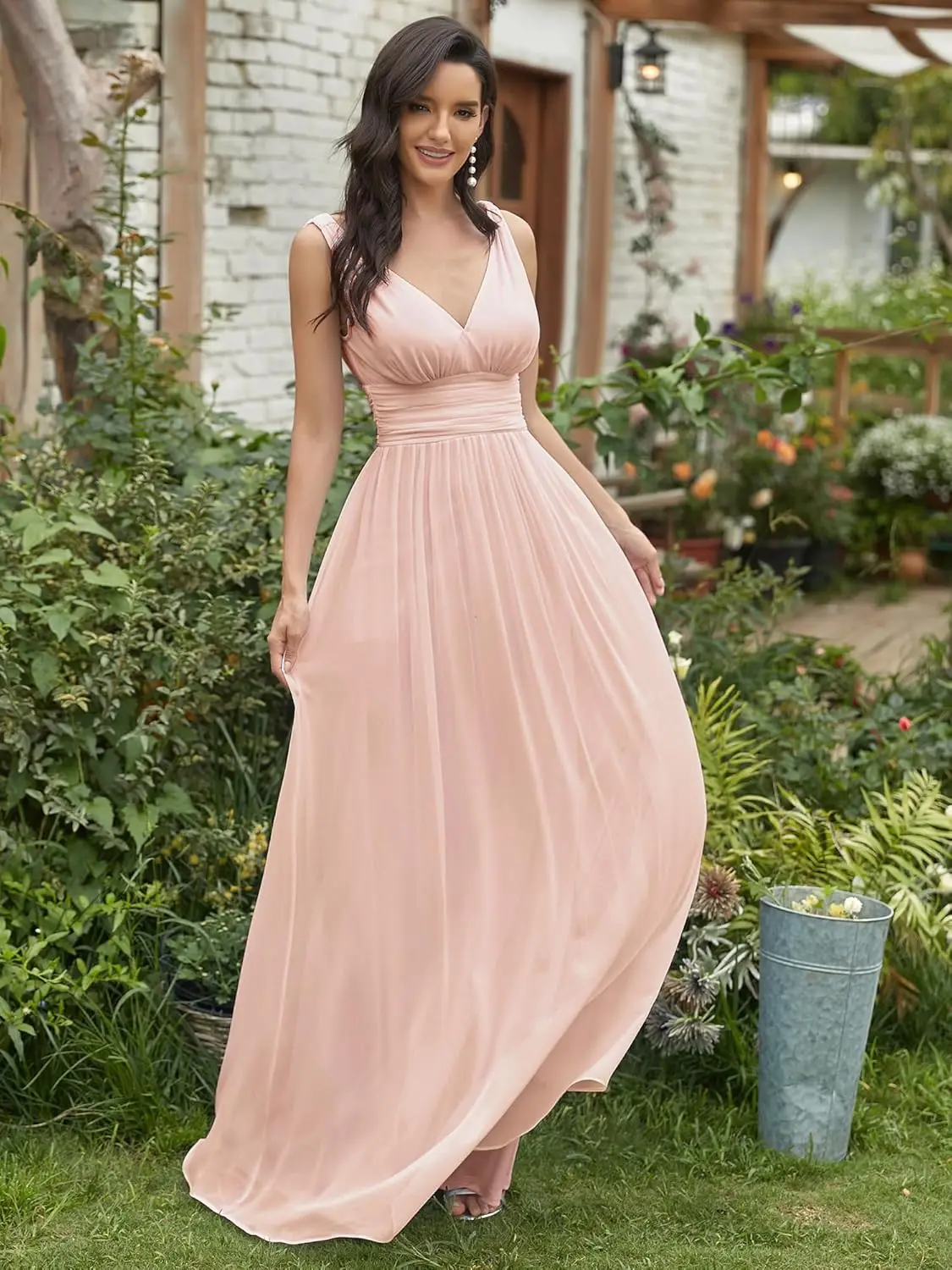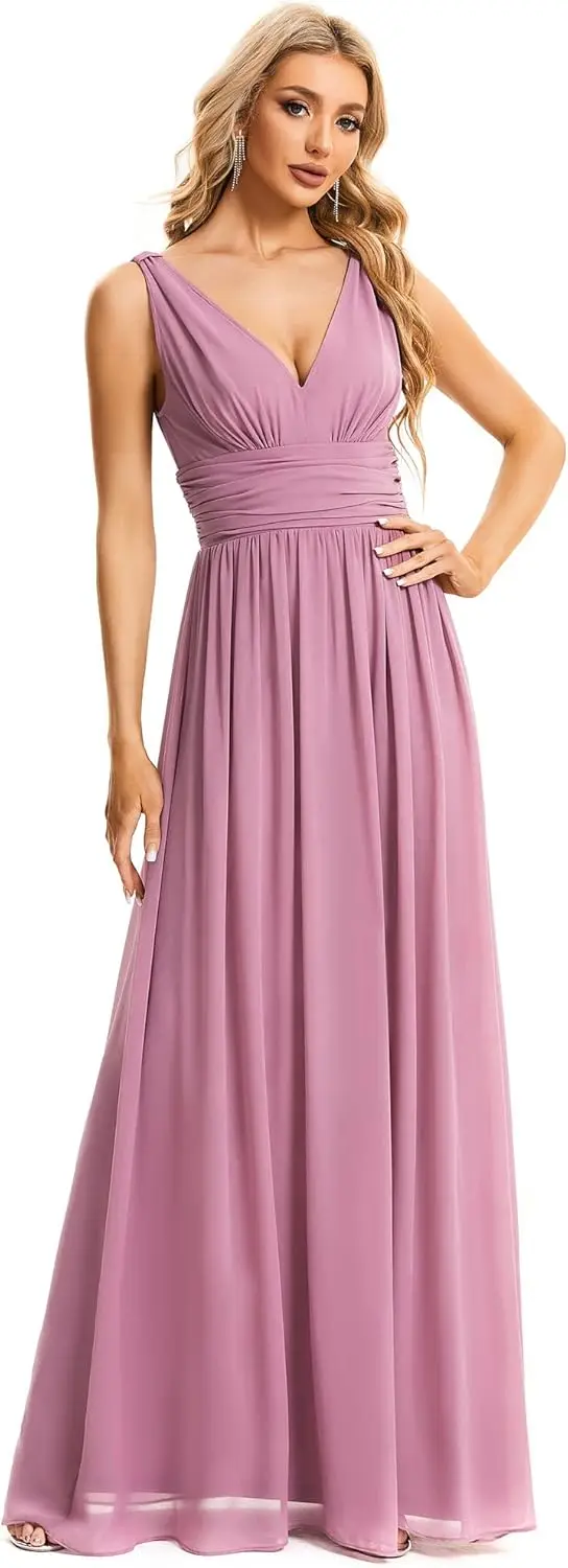 Damen Brautjungfernkleid V-Ausschnitt Ärmellos A-Linie Chiffon Bodenlang Abendkleid Hochzeitsgastkleid Ballkleid