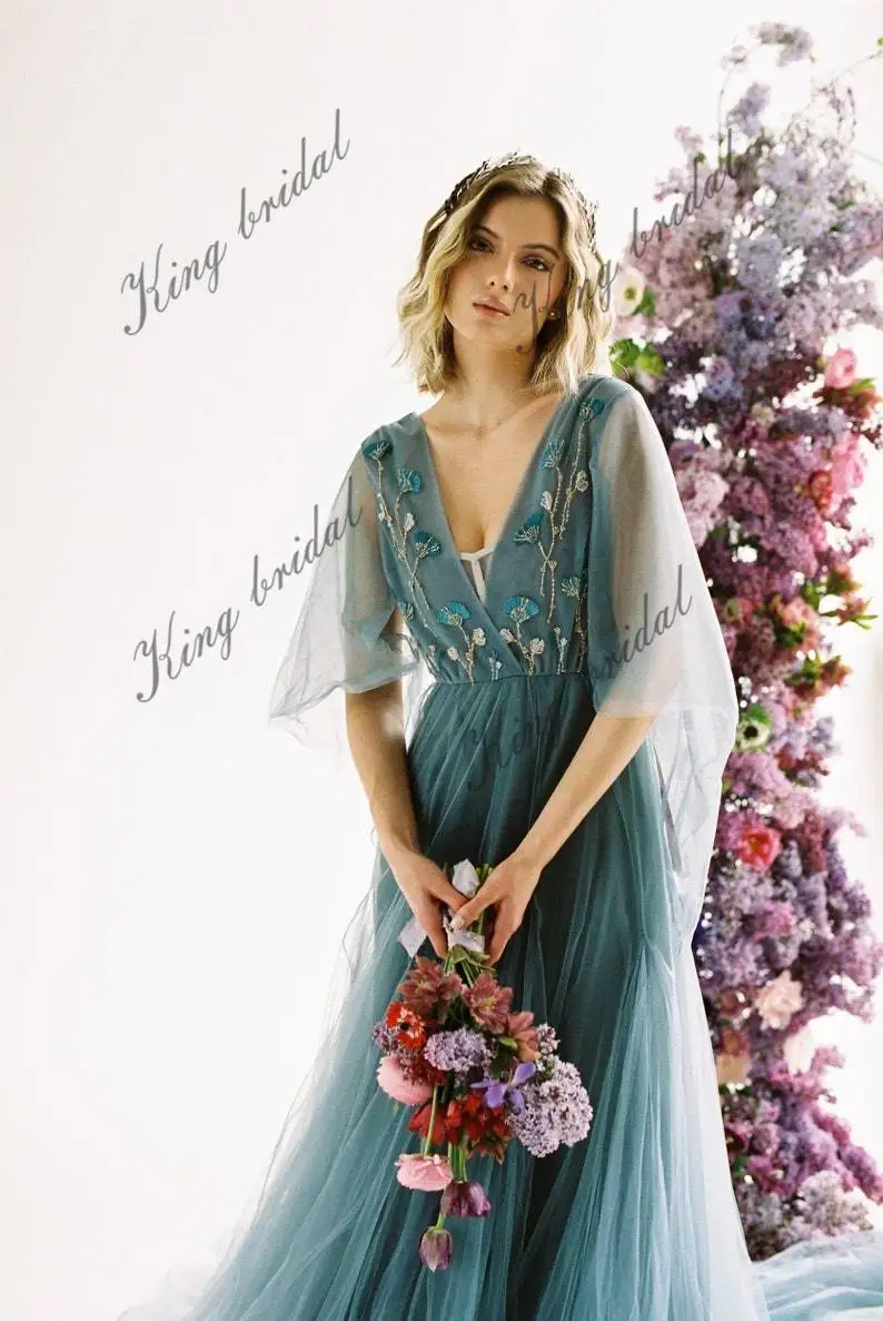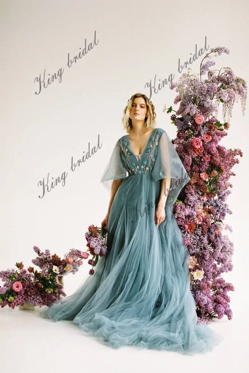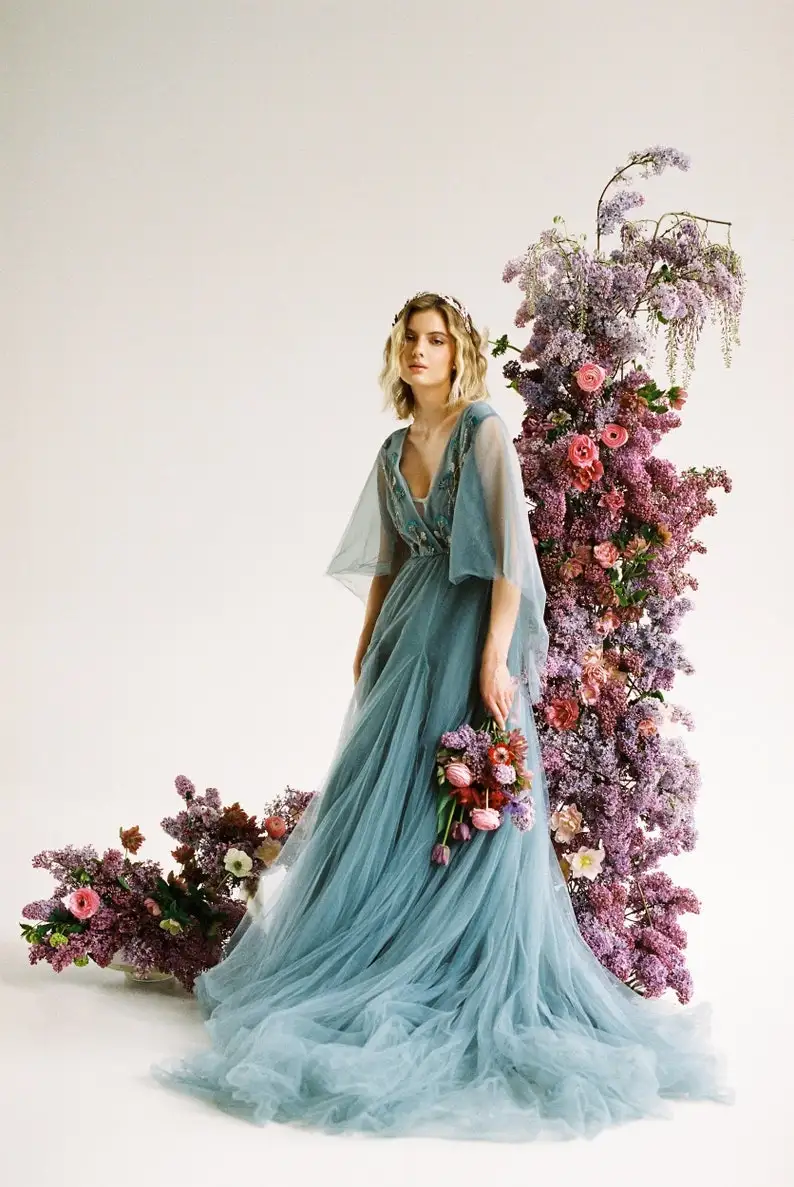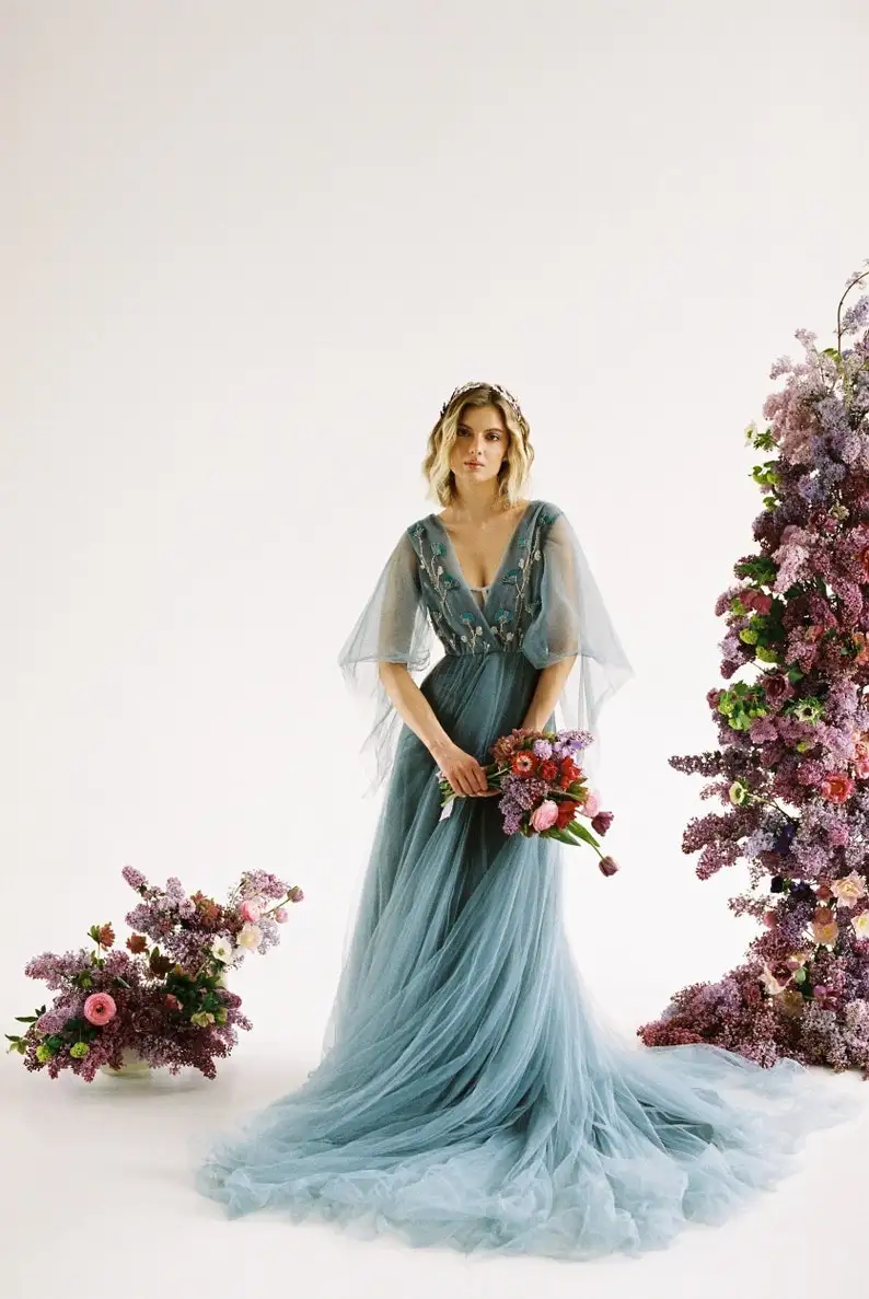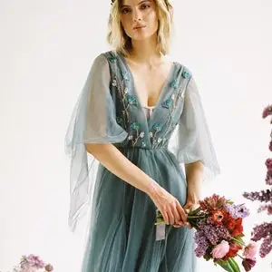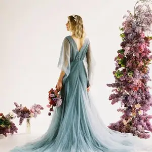 Nuestro vestido de novia de tul azul pálido bordado a mano, con cola capilla, escote en V y mangas ángel, crea una silueta romántica. El corsé interior independiente con tirantes ajustables garantiza un ajuste cómodo y seguro. El top presenta detalles florales elaborados con hilo mouliné y cuentas. La falda, con una larga cola, está compuesta por capas de seda y tul.