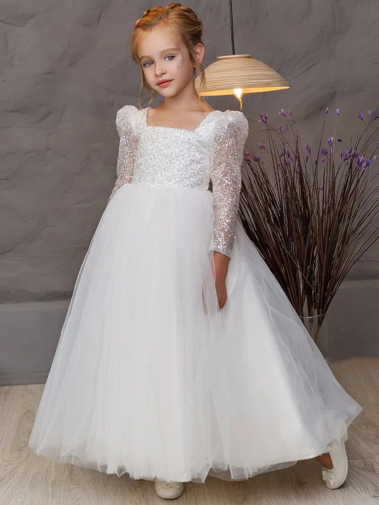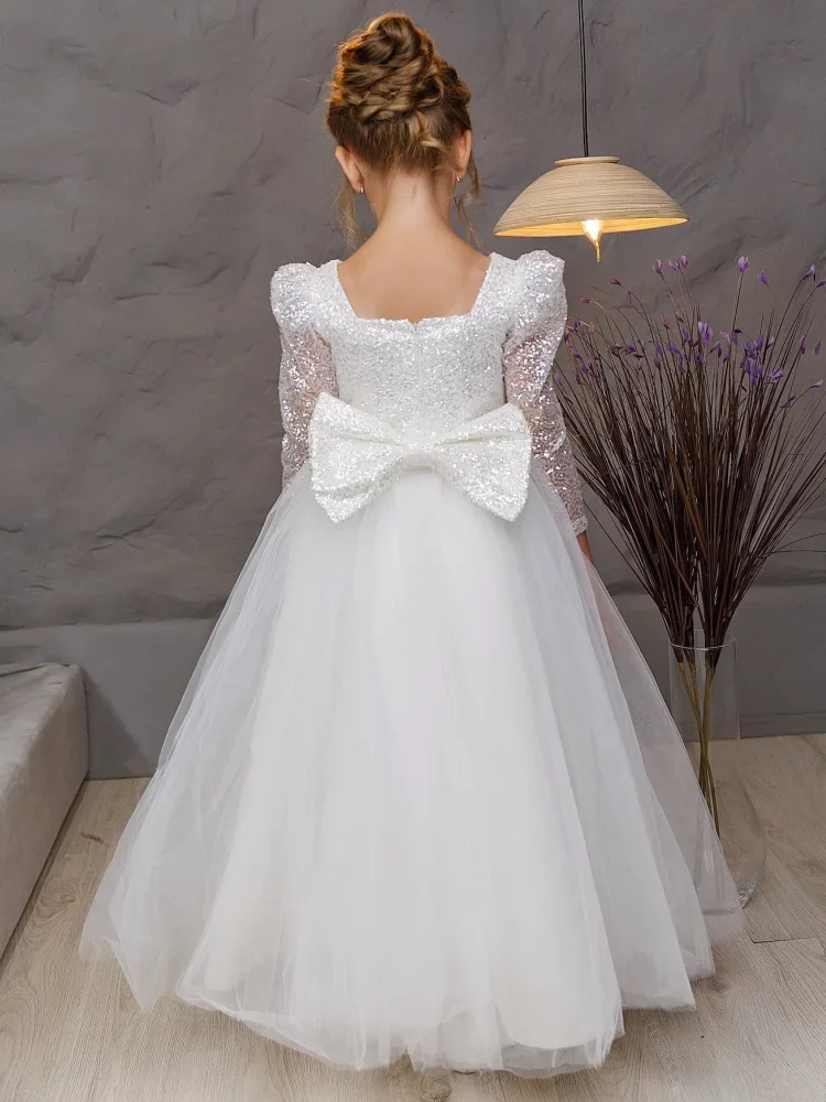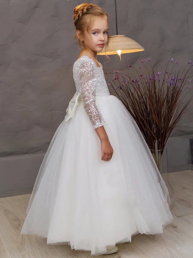 Vestido de niña de flores, vestido de tul blanco con lentejuelas y lazo, mangas largas para boda, cumpleaños, desfile, primera comunión.