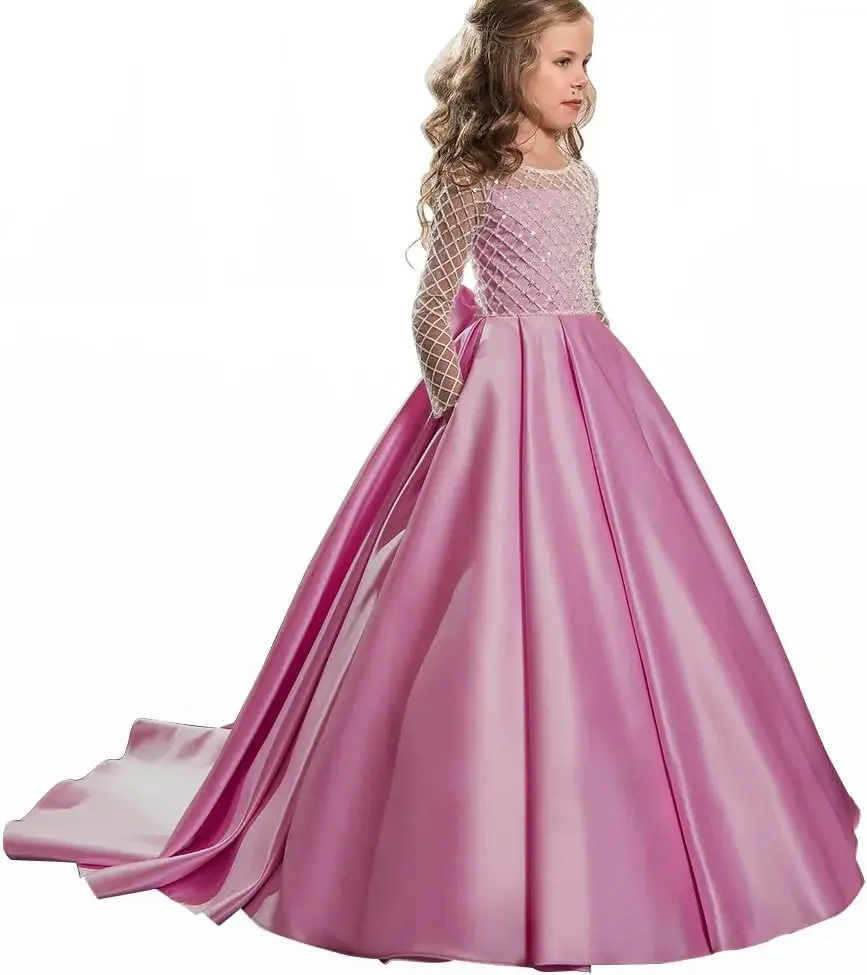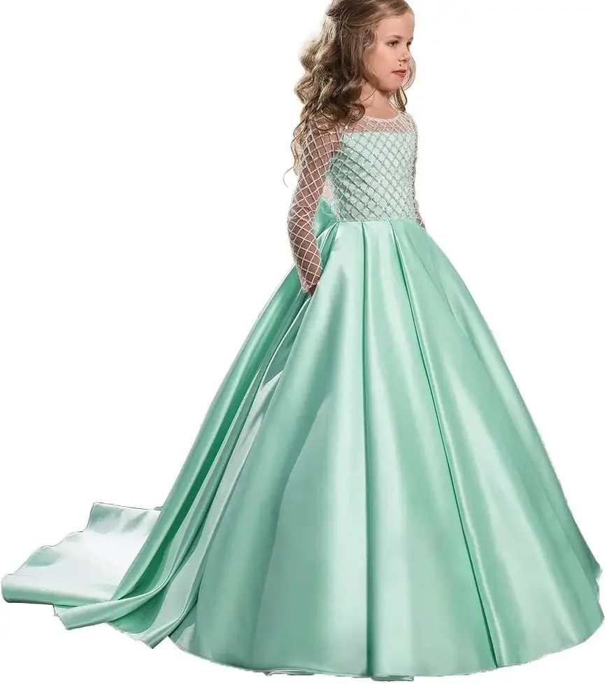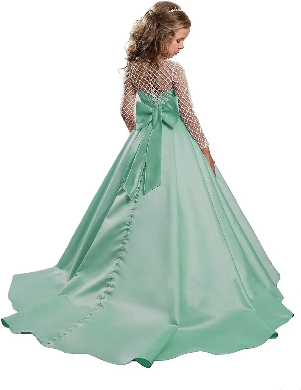 Vestidos elegantes de satén con lazo para niña, largos hasta el suelo, para fiesta de cumpleaños, primera comunión, para boda