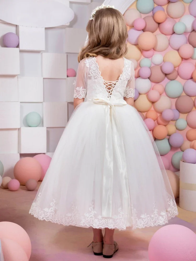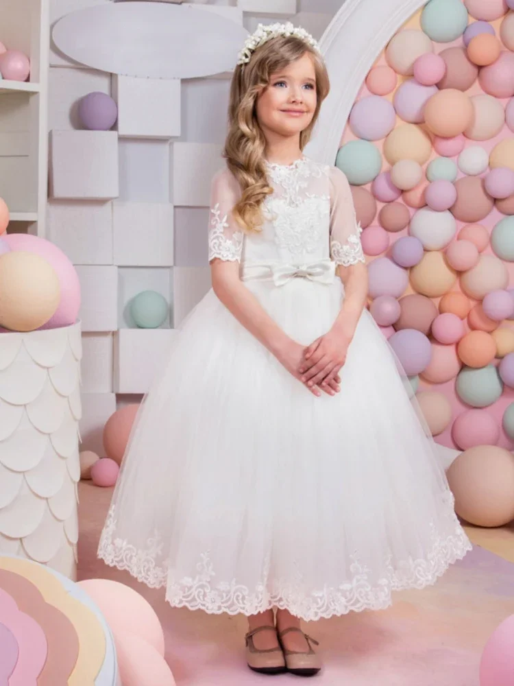 Vestidos de primera comunión para banquetes de cumpleaños, vestidos de niña de las flores con apliques de encaje blanco y lazo, media manga para boda