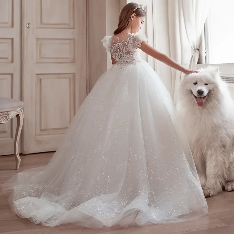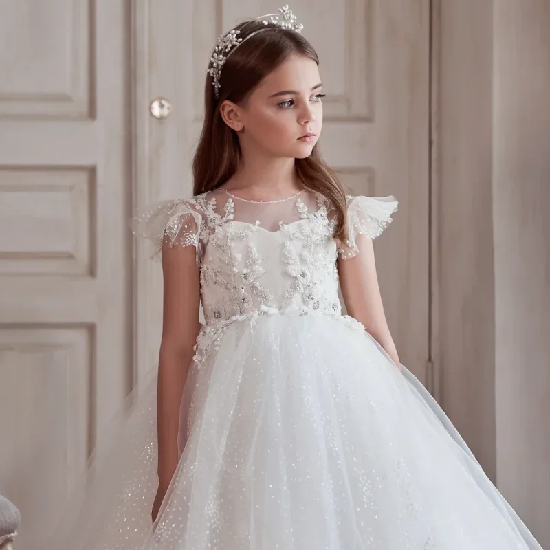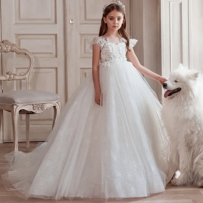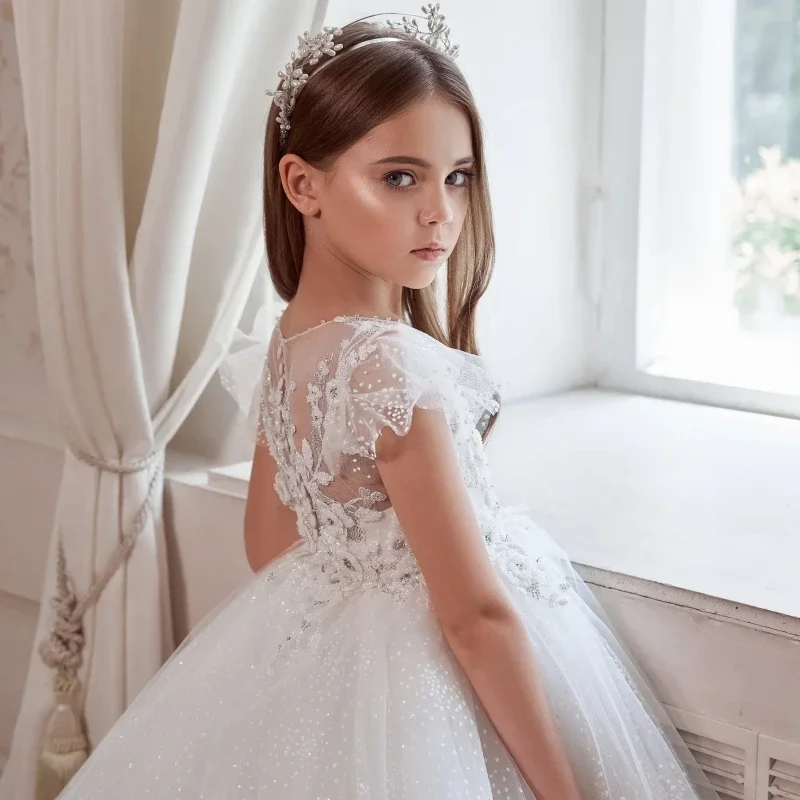 Vestidos de fiesta de cumpleaños para banquetes, vestidos de niña de las flores con apliques de tul blanco y estampado floral con mangas cortas para bodas.