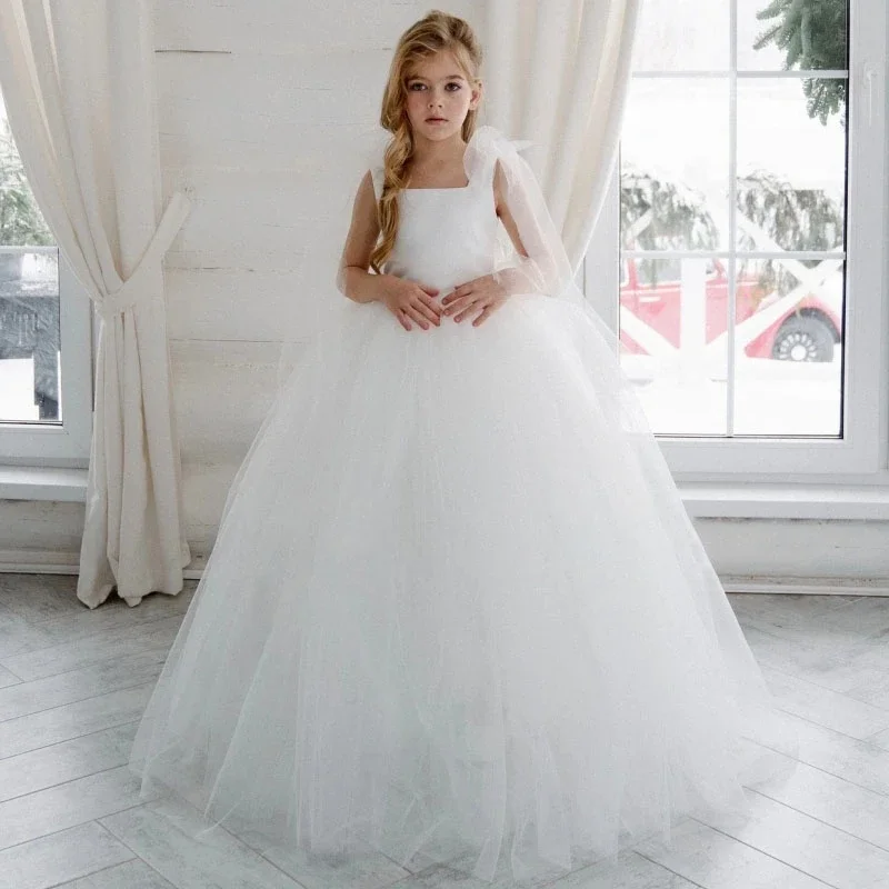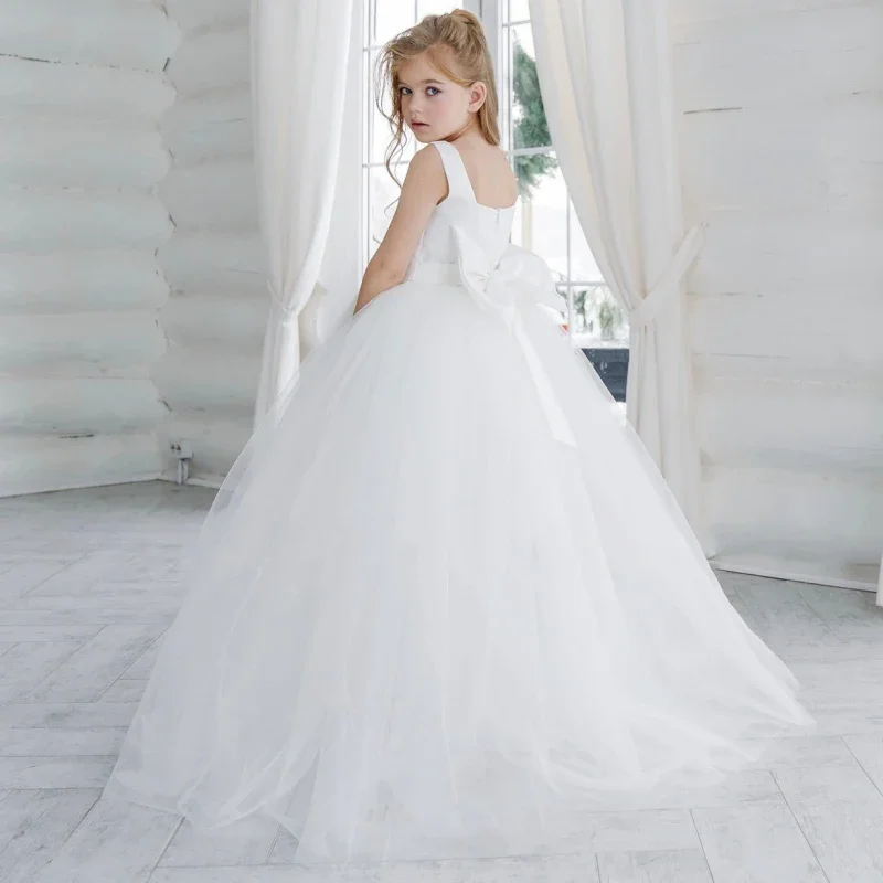 Vestido de niña de las flores personalizado, de tul blanco con lazo, sin mangas, para fiesta de cumpleaños, banquete, comunión, boda