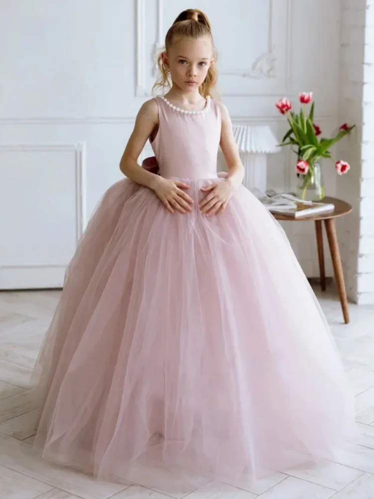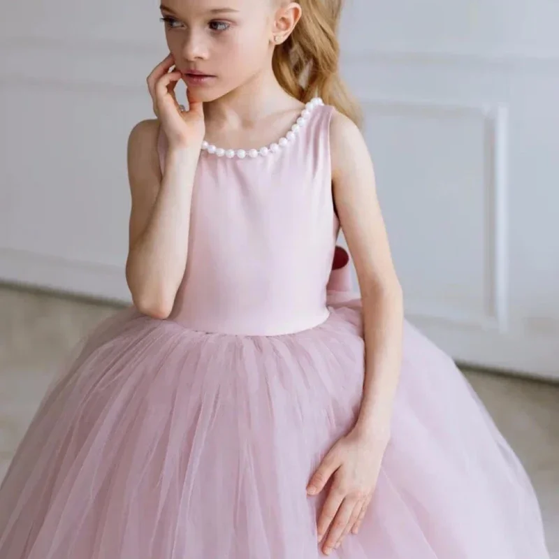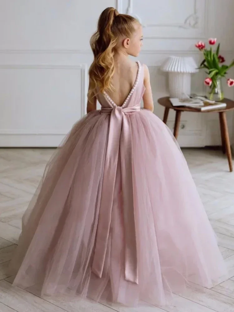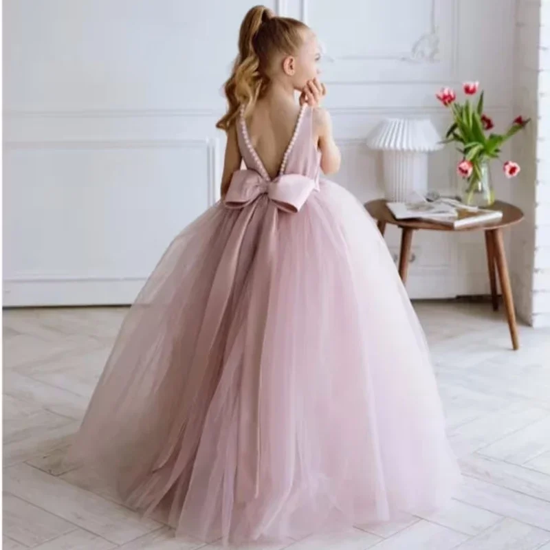 Vestidos de princesa para banquetes de fiesta de cumpleaños, vestidos de niña de las flores, tul rosa polvoriento, cuello de perlas con lazo y cinturón, sin mangas para boda