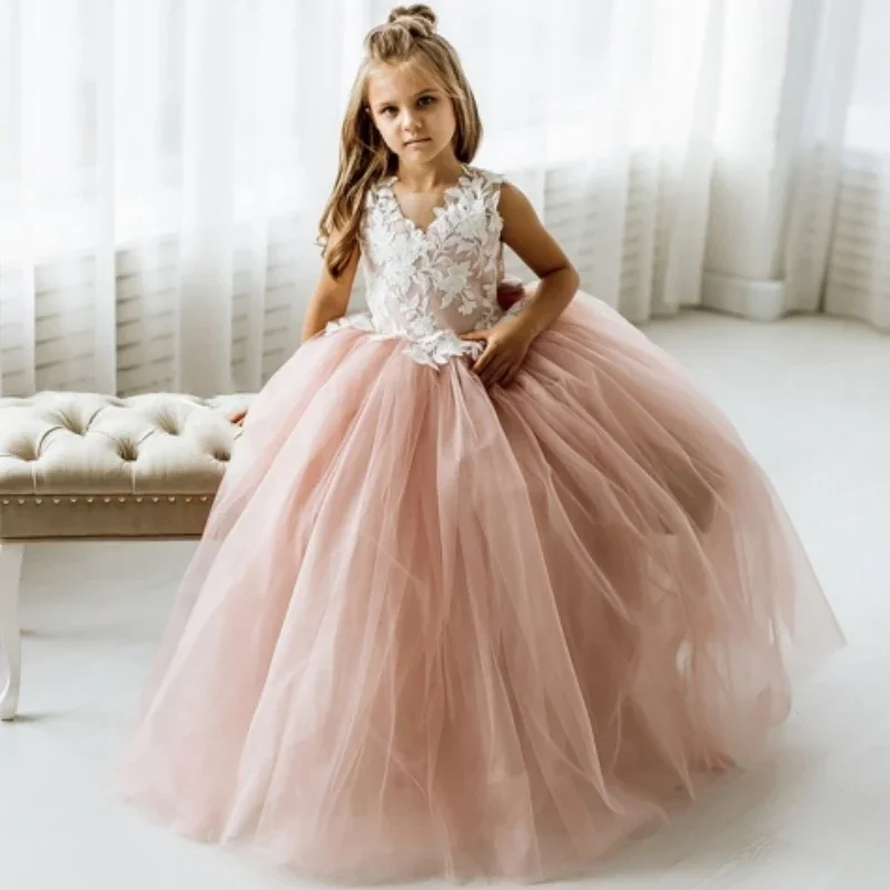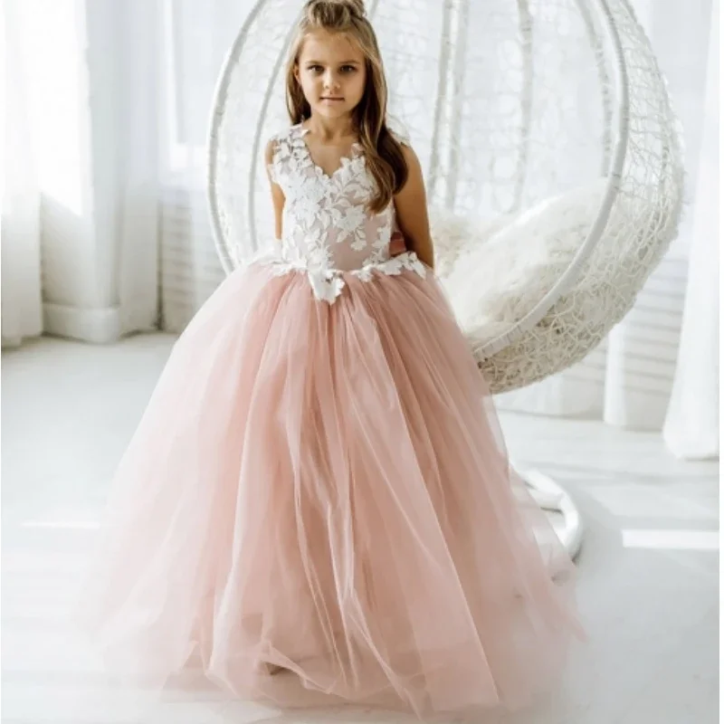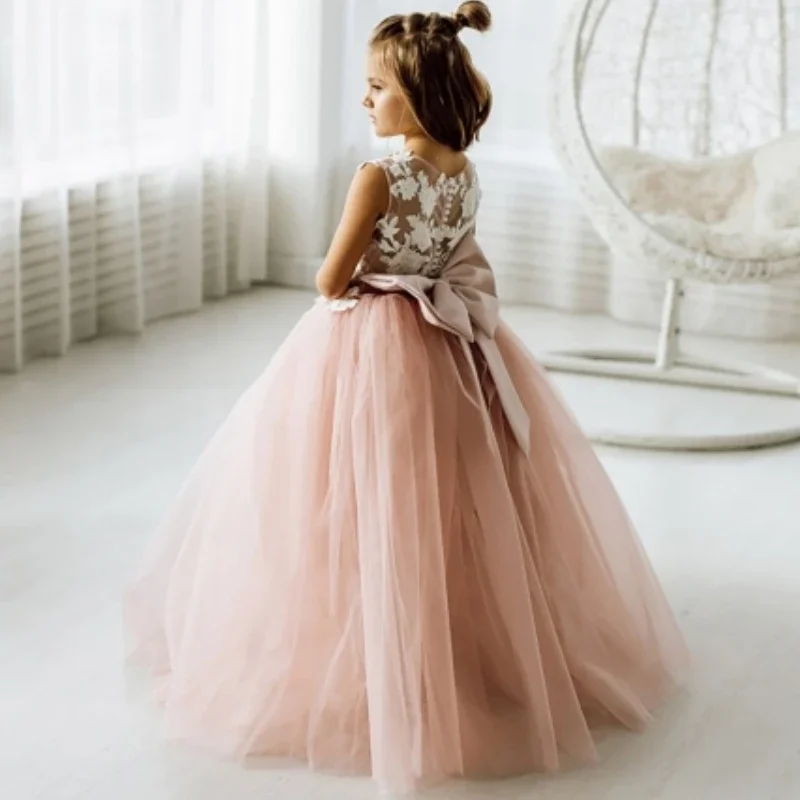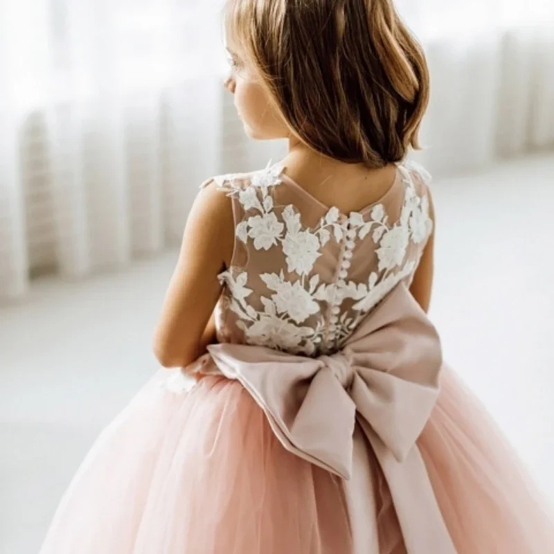 Vestidos de primera comunión para fiesta de cumpleaños, vestidos de niña de las flores, tul rosa polvoriento, apliques blancos con lazo, sin mangas para boda