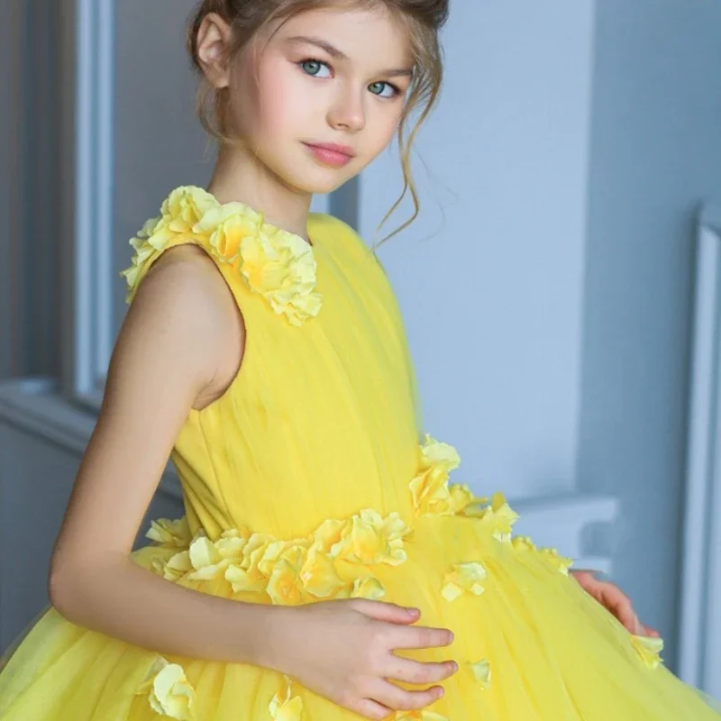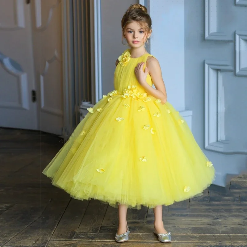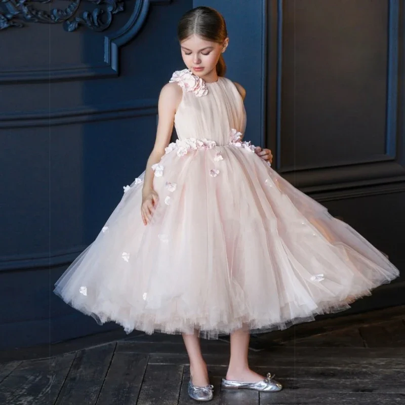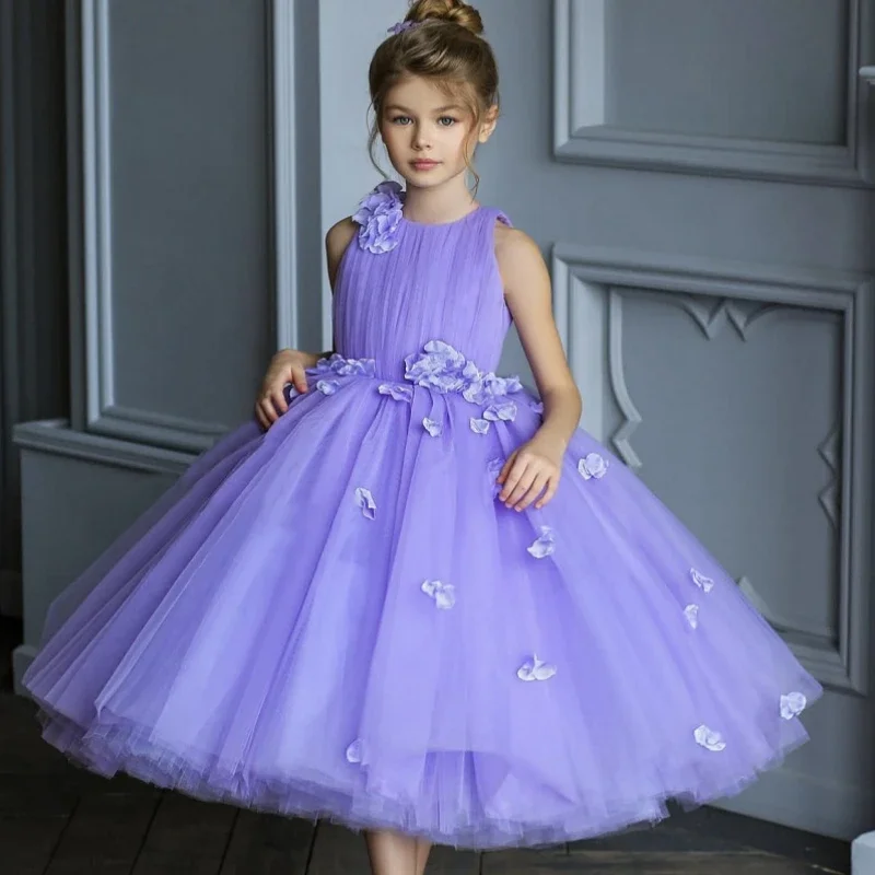 Vestidos de primera comunión para fiesta de cumpleaños, vestidos de niña de las flores de tul morado, hinchados con flores y pétalos, sin mangas para boda
