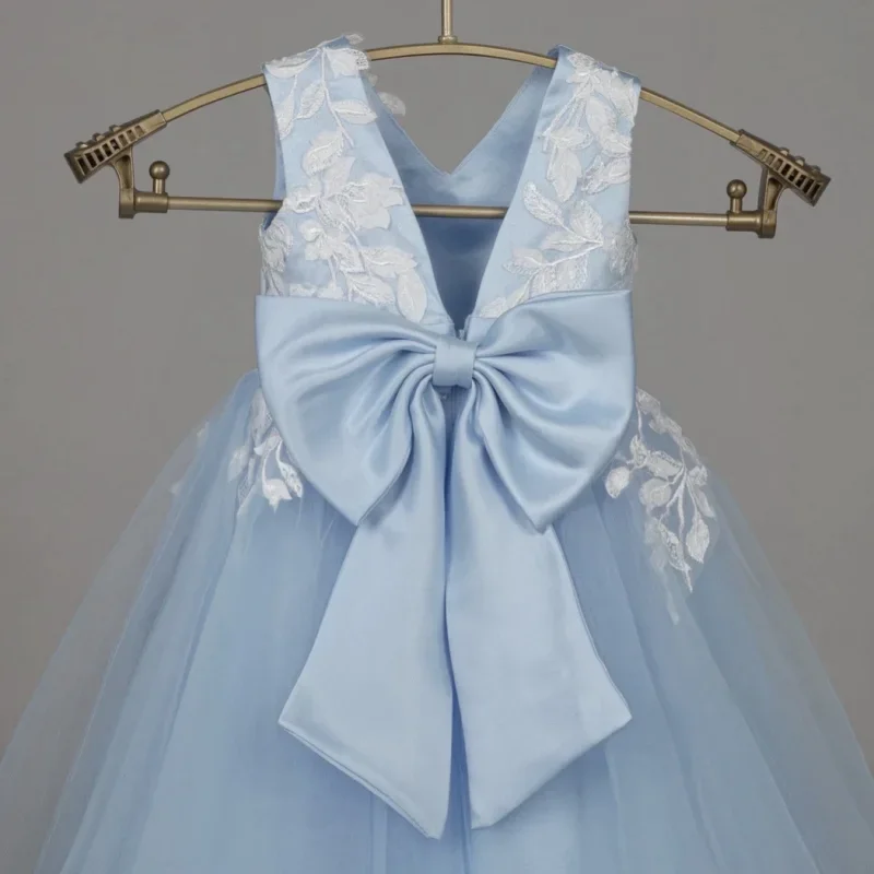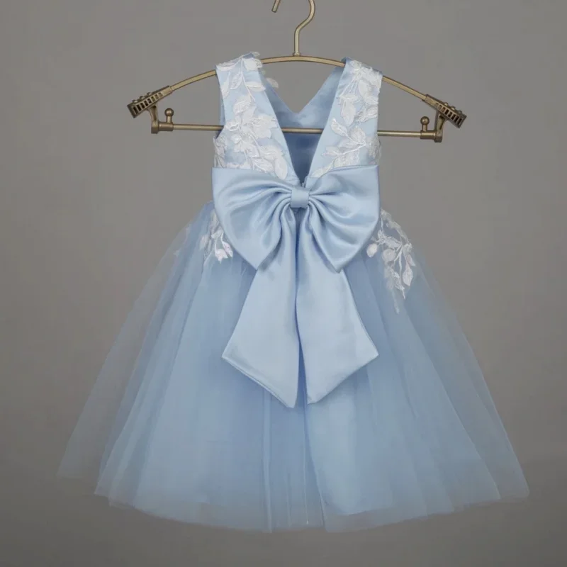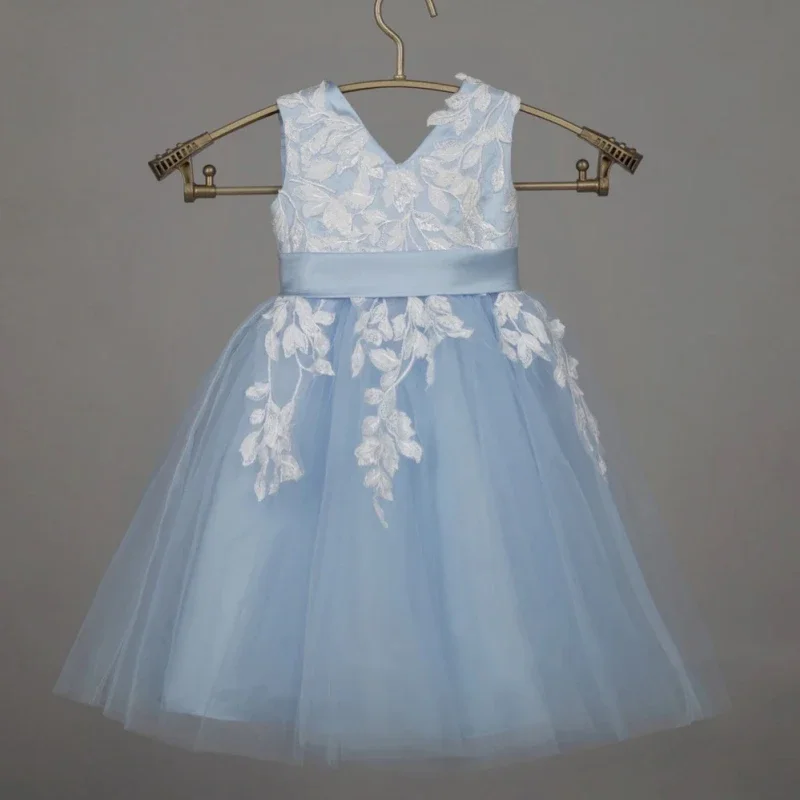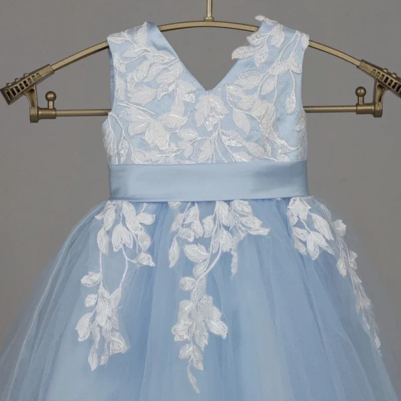 Vestidos de comunión para fiesta de cumpleaños, vestidos de niña de las flores de tul azul cielo, apliques de flores blancas con lazo, sin mangas para boda