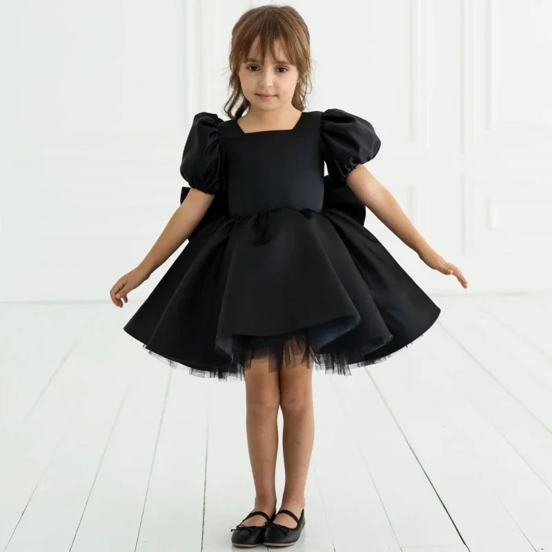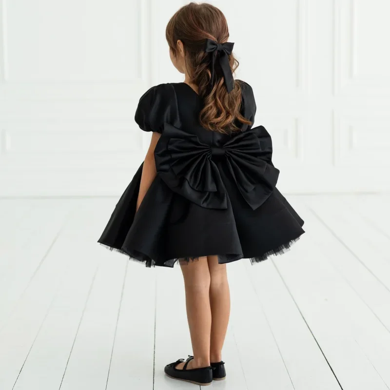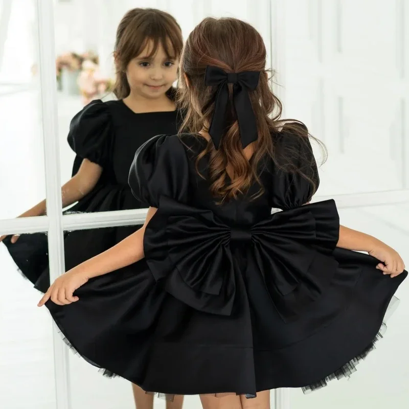 Vestidos de tul satinado negro con lazo, mangas cortas, para bodas, cumpleaños, graduaciones, comuniones, personalizados, para niñas de las flores.