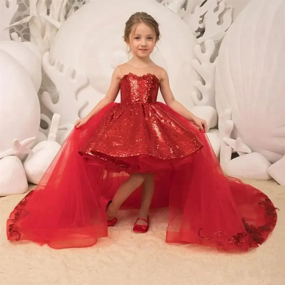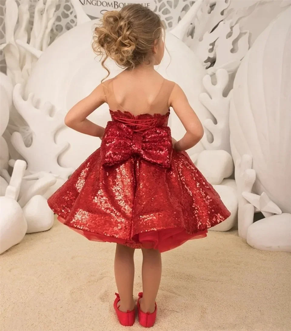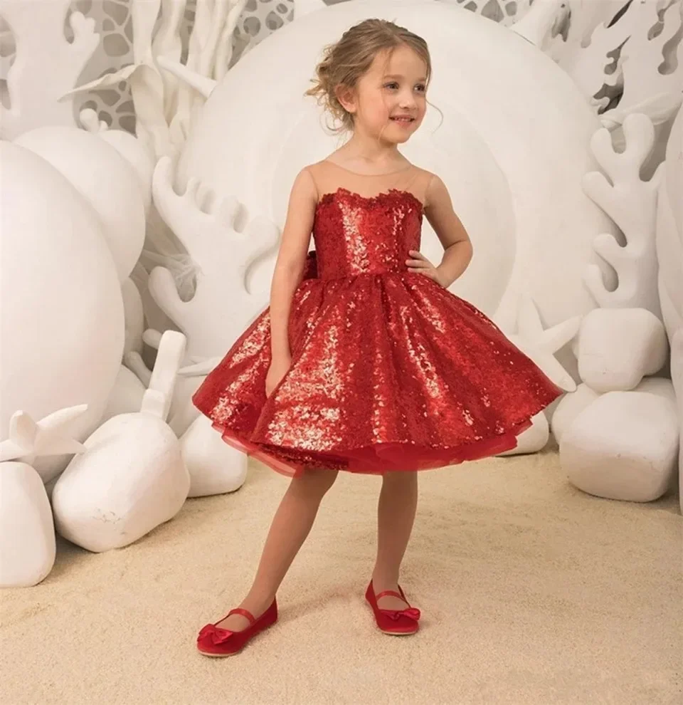 Vestido rojo de primera comunión con lazo y lentejuelas brillantes, cuello redondo, para fiesta de cumpleaños de niña, para boda