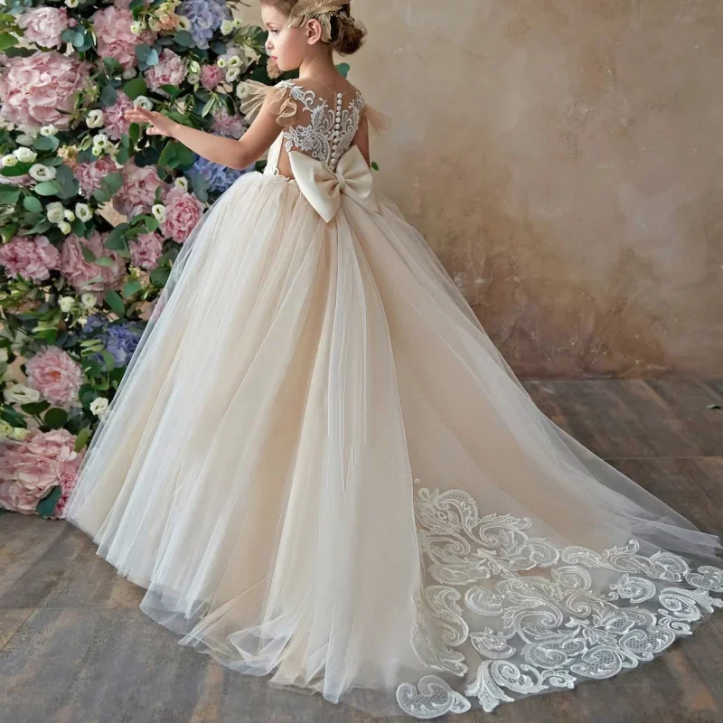 Apliques de encaje de perlas color champán con lazo y cola para bodas, cumpleaños, primera comunión, niñas de las flores
