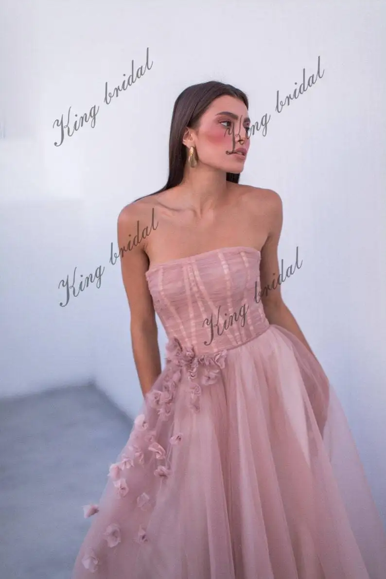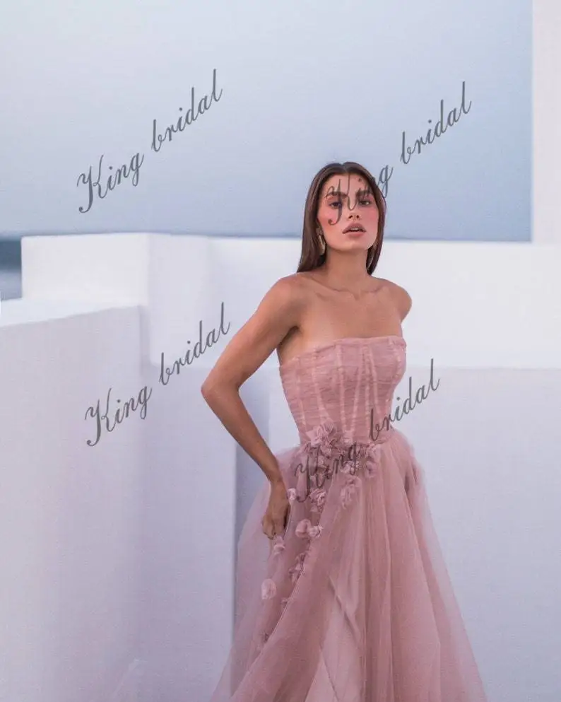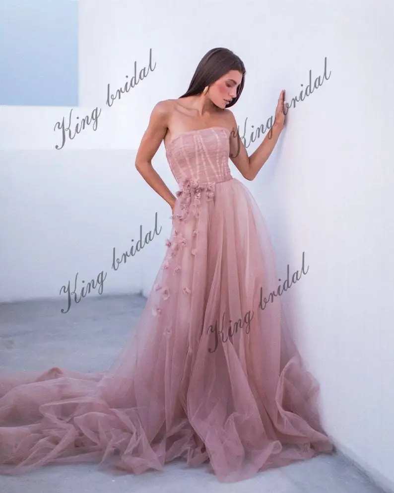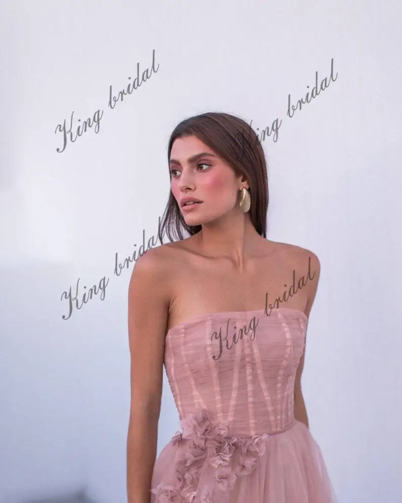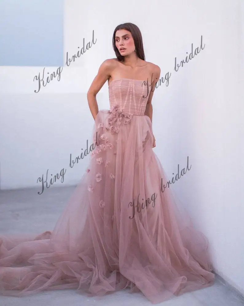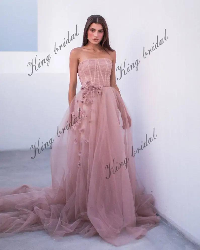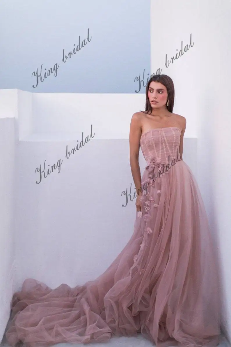 Nuestro romántico vestido de novia en tonos rosa frío está diseñado para hacerte sentir como una verdadera princesa en tu día especial. El corsé ajustado sin tirantes está delicadamente cubierto con tul suave, creando una silueta favorecedora que realza tus curvas. El escote recto añade un toque de elegancia y encanto atemporal. Flores 3D bordadas a mano adornan la falda, dándole un toque romántico y caprichoso. Con una falda de tul de corte A y una elegante cola, este vestido irradia gracia y sofisticación al caminar hacia el altar.