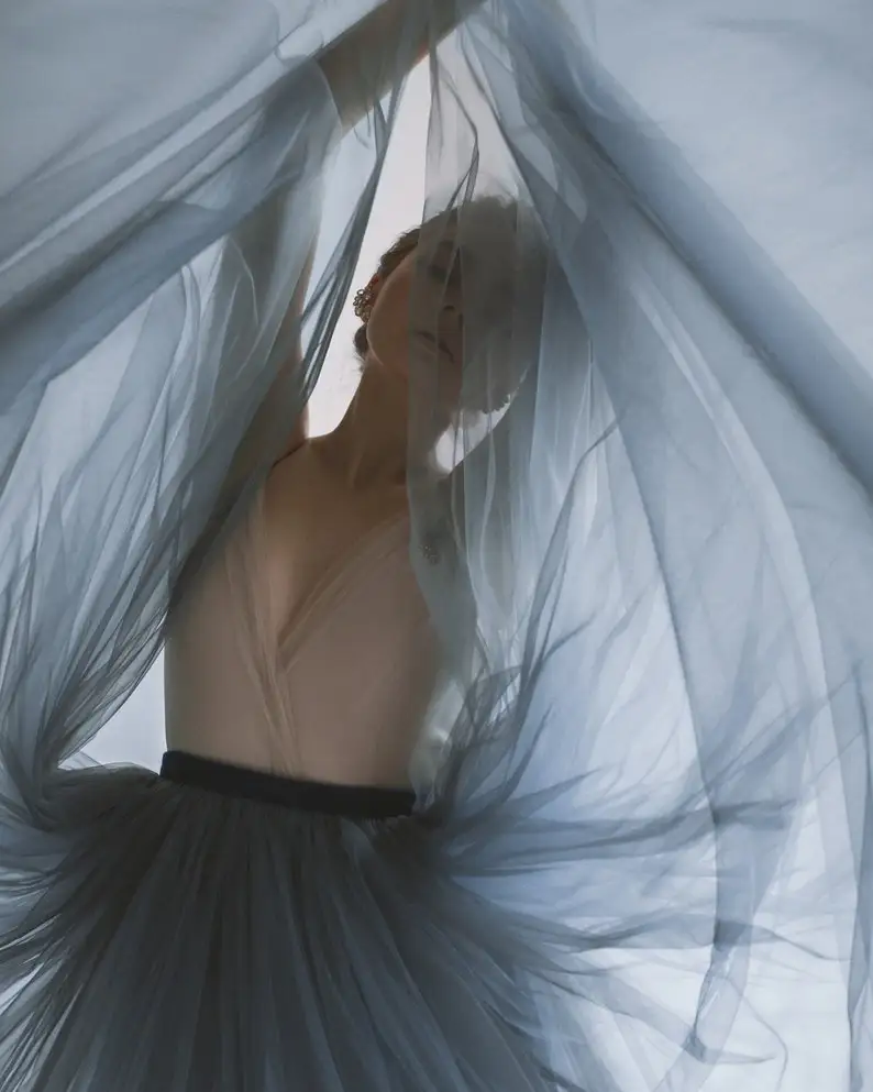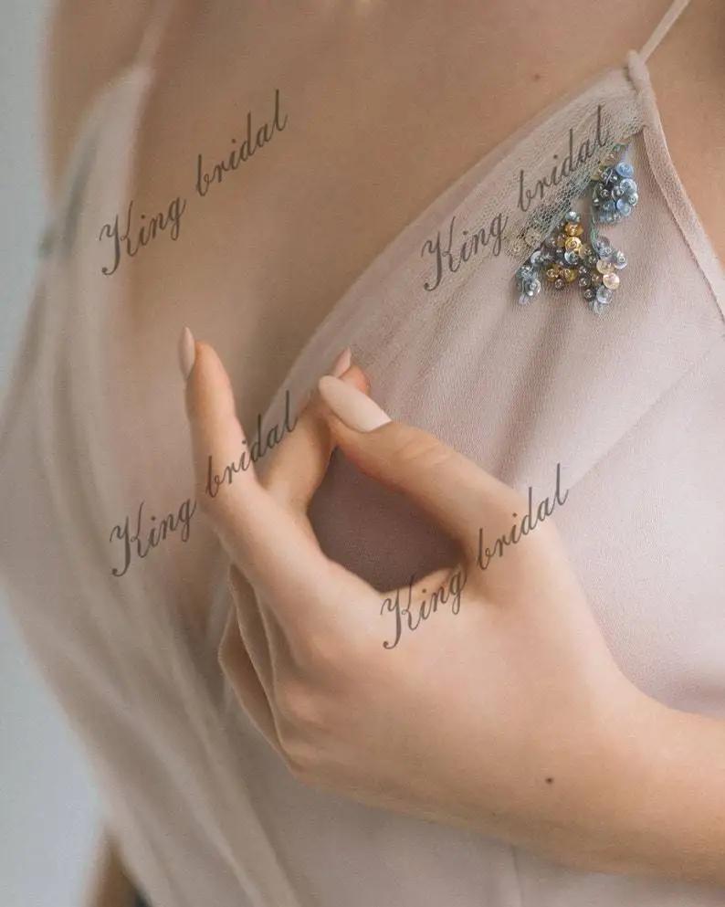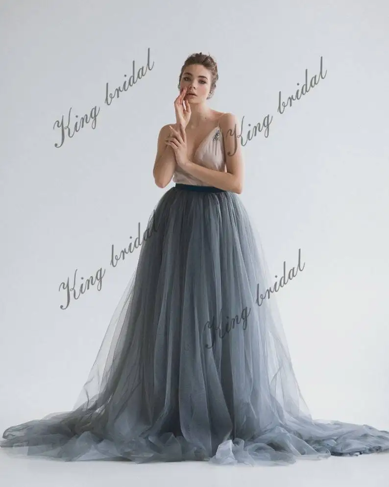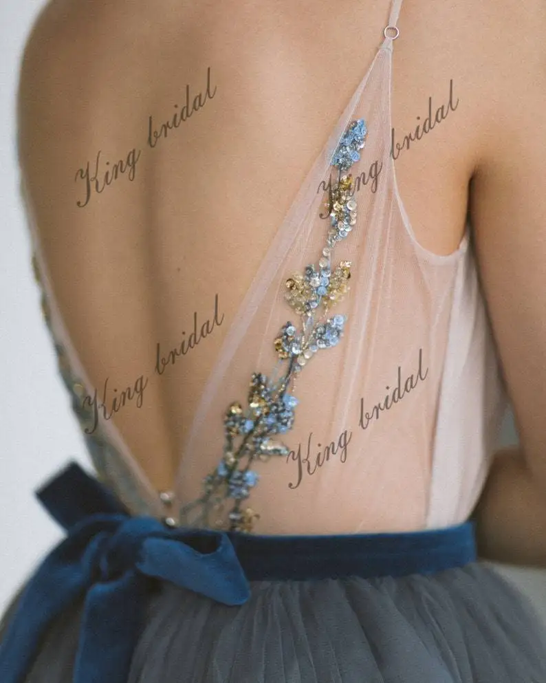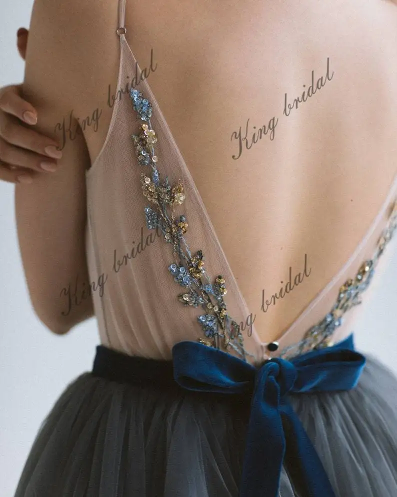 Presentamos nuestro exquisito vestido de novia de tul con corte en A, diseñado para evocar un encanto elegante y etéreo en tu día especial. El top beige grisáceo está adornado con un bordado artesanal único, con delicadas flores elaboradas con hilo mouliné, cuentas y lentejuelas. La parte delantera y trasera del vestido lucen estos intrincados detalles, mientras que el escote en V está bellamente acentuado con tul drapeado. La falda azul oscuro luce múltiples capas de lujosa seda y tul, creando un look voluminoso y etéreo. Con un discreto cierre de cremallera oculto en la espalda, este vestido también incluye un cinturón de terciopelo con lazo para un toque de opulencia. Realza tu conjunto nupcial con este cautivador vestido y causa una impresión duradera al caminar hacia el altar.
