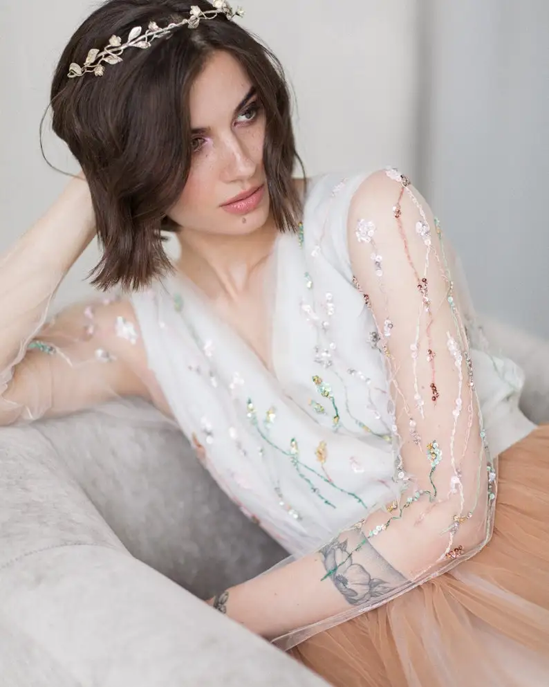 Luce un estilo único el día de tu boda con nuestro impresionante vestido de novia con espalda transparente. Este exquisito vestido presenta mangas largas ajustadas y un cautivador top beige adornado con un intrincado bordado floral hecho a mano. El escote en V delantero está elegantemente cubierto con un suave tul, que le aporta un toque romántico y femenino. La voluminosa falda de tul luce una hermosa combinación de dos tonos: cobre y marfil suave, creando un look único y encantador. Con su larga cola, este vestido irradia gracia y elegancia al caminar hacia el altar. Confeccionado con forro de seda vegana, no solo luce espectacular, sino que también refleja tus valores. Deja volar tu imaginación y crea recuerdos inolvidables en tu día especial.