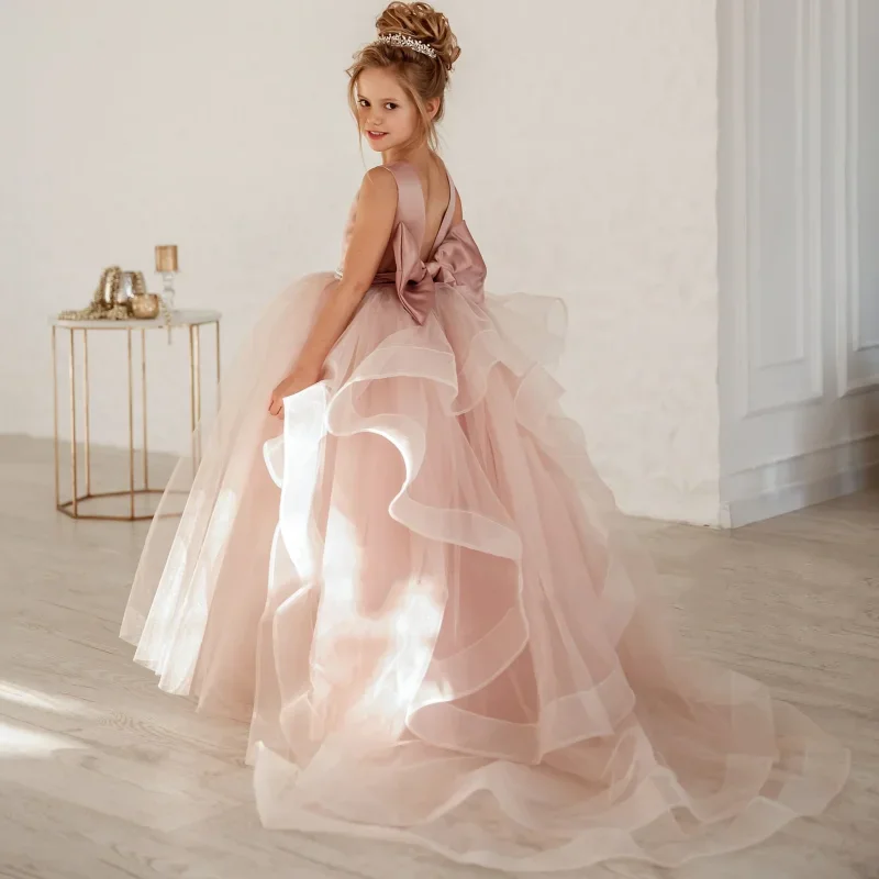Vestido de princesa para fiesta de cumpleaños, banquete, de noche, para niña de las flores, de tul rosa polvoriento, con cinturón de perlas escalonado y lazo para boda