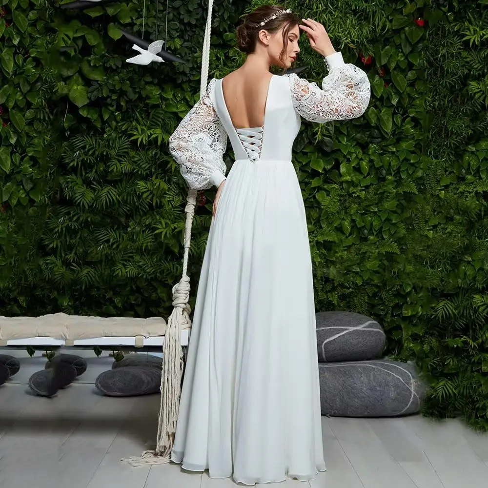 Vestidos de dama de honor de manga larga, vestido de fiesta de gasa, vestido de novia largo con apliques de encaje, vestidos formales con escote en V y abertura