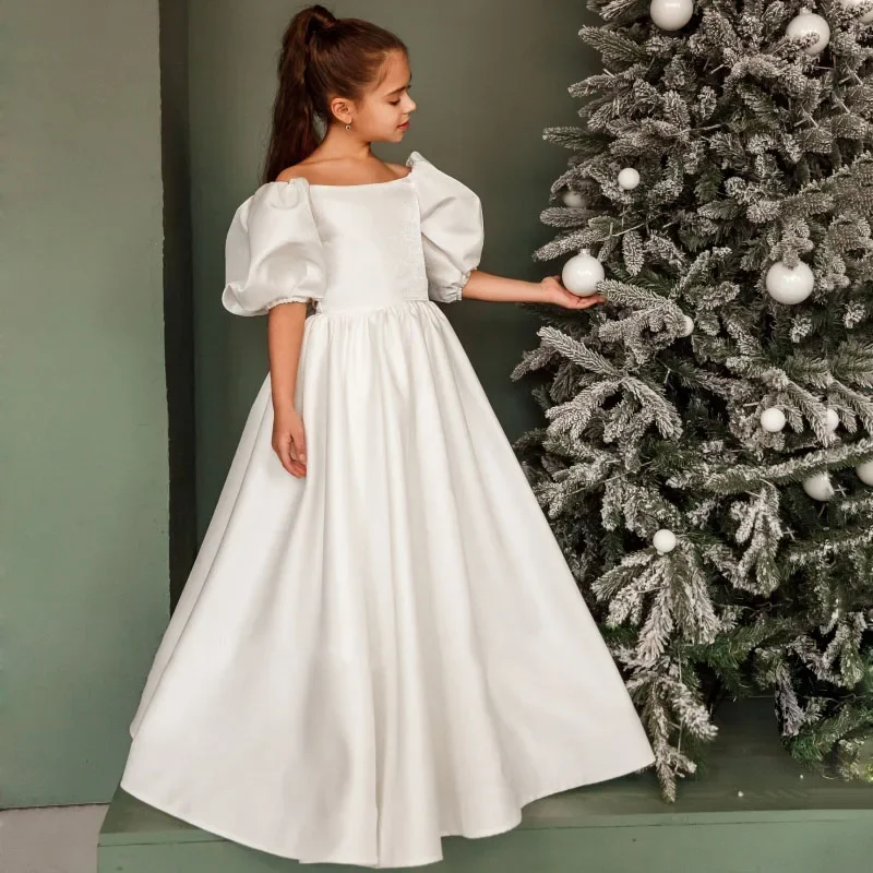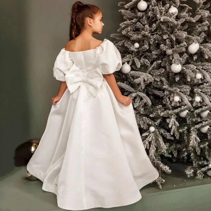 Satén marfil liso con lazo, manga corta, para boda, fiesta de cumpleaños, graduación, comunión, vestidos personalizados para niña de las flores.