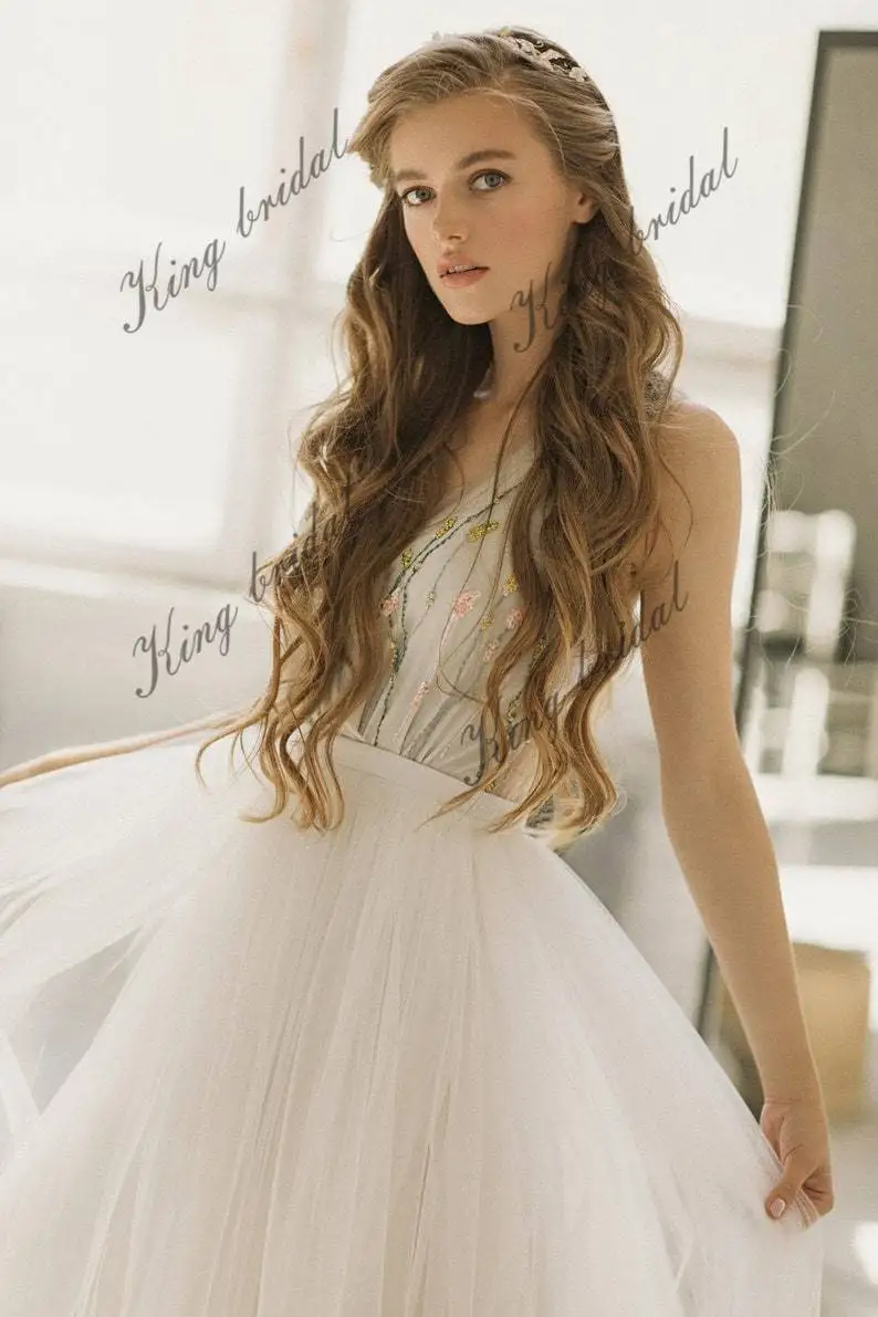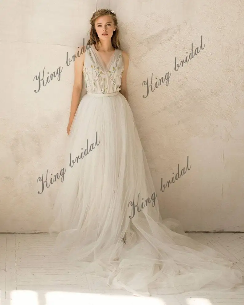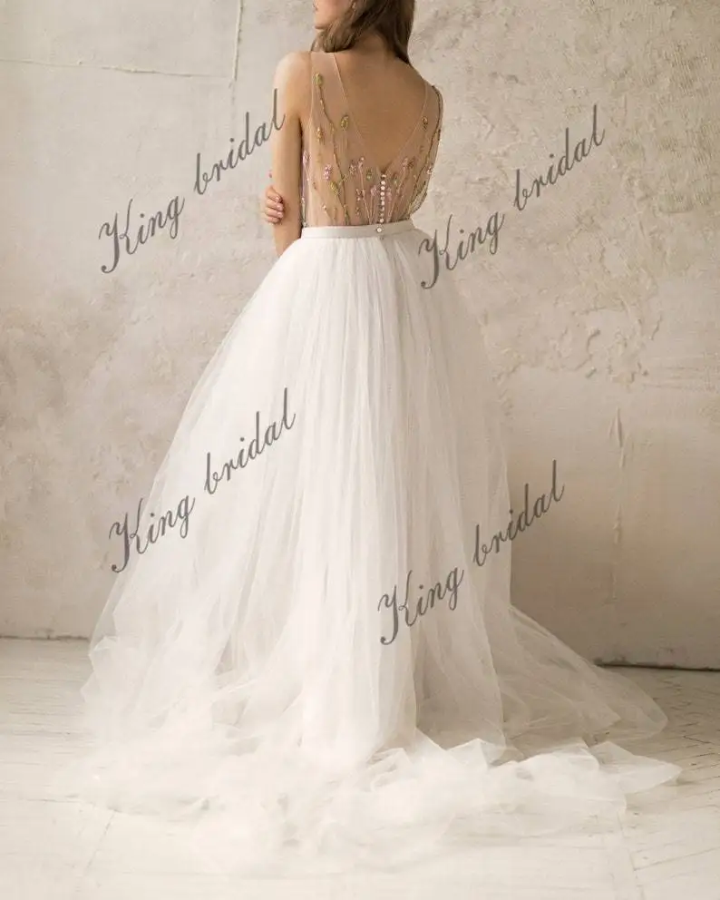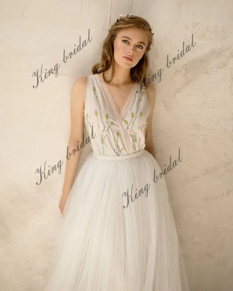 Realza tu estilo nupcial con nuestro impresionante vestido de novia sin mangas en blanco roto/marfil. Con un favorecedor escote en V adornado con un delicado tul drapeado, este vestido irradia sofisticación y encanto. La parte superior bordada a mano luce exquisitas flores multicolores, aportando un toque de fantasía y romance. La voluminosa falda de tul con una elegante cola completa el look, creando una silueta cautivadora al caminar hacia el altar. Elaborado con atención al detalle y la calidad, este vestido de novia es la elección perfecta para la novia moderna que busca elegancia e individualidad en su día especial.