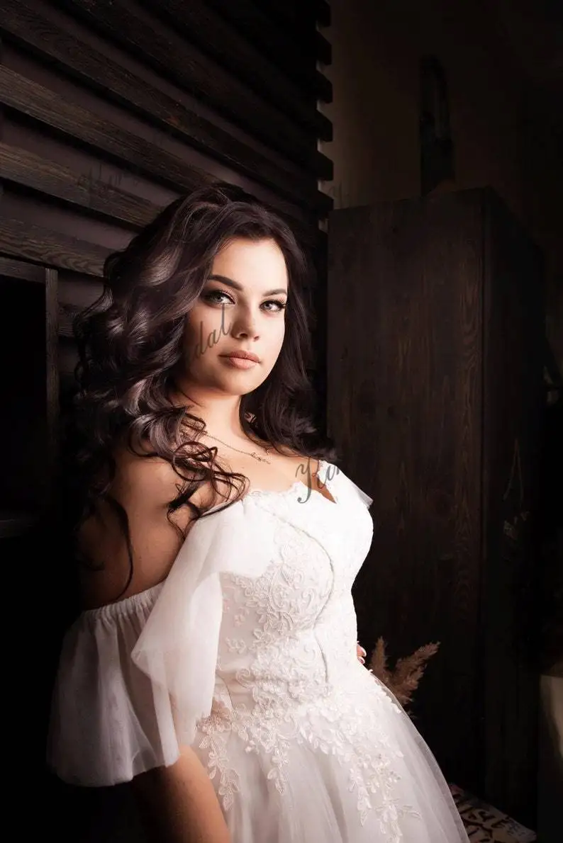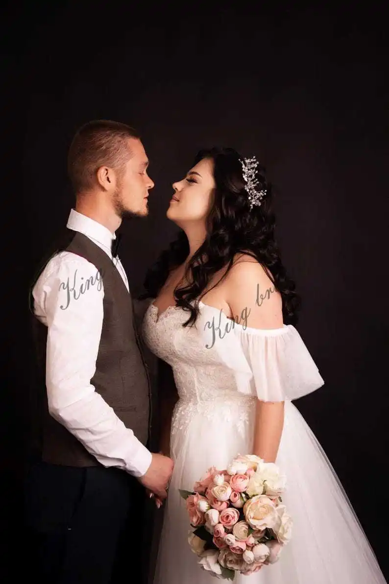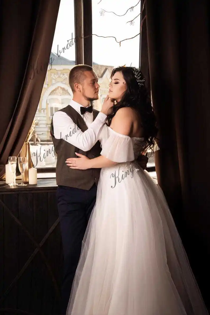 Vestido de novia corte A en tul marfil, con mangas cortas y bandas elásticas.