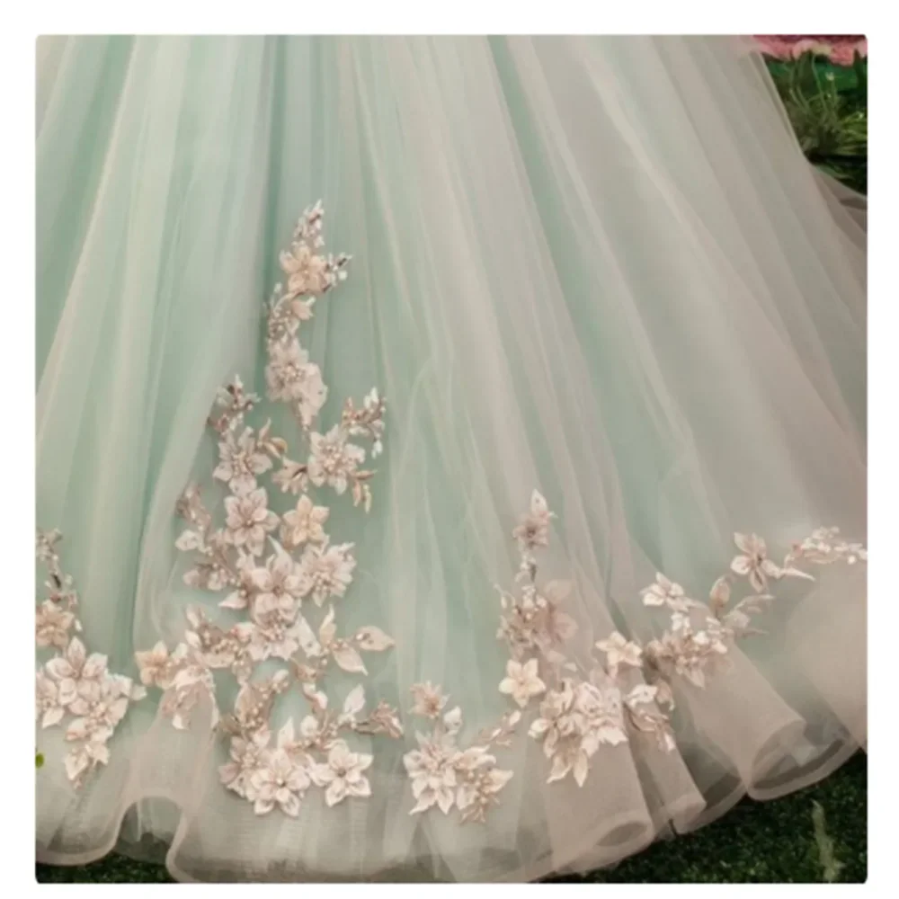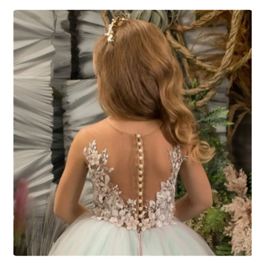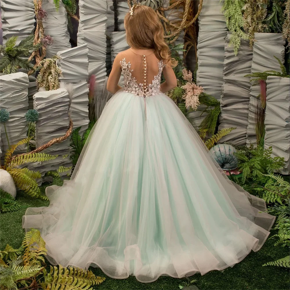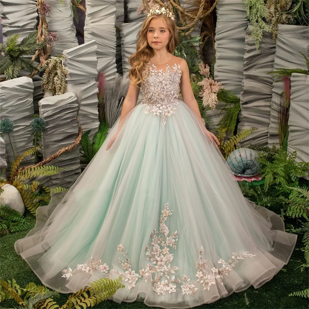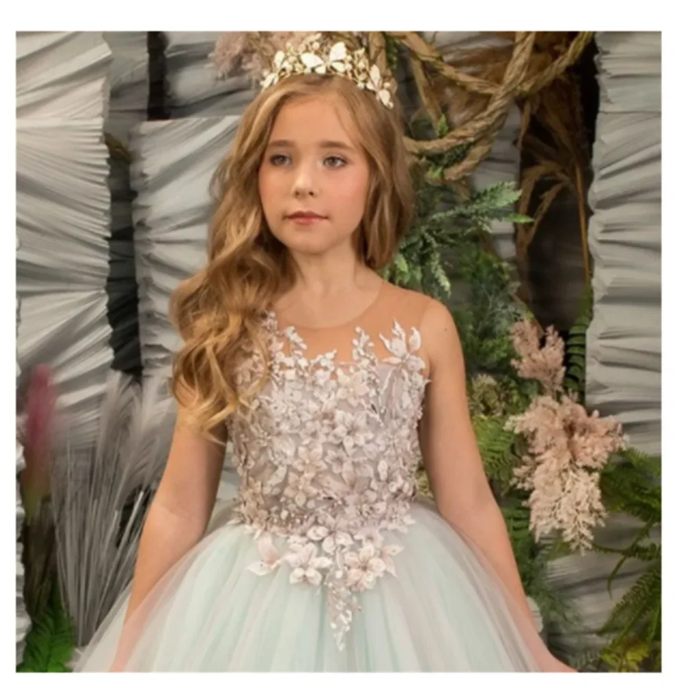 Vestido de novia elegante con encaje verde menta, plisado, con cuentas y flores 3D para primera comunión, de tul esponjoso.