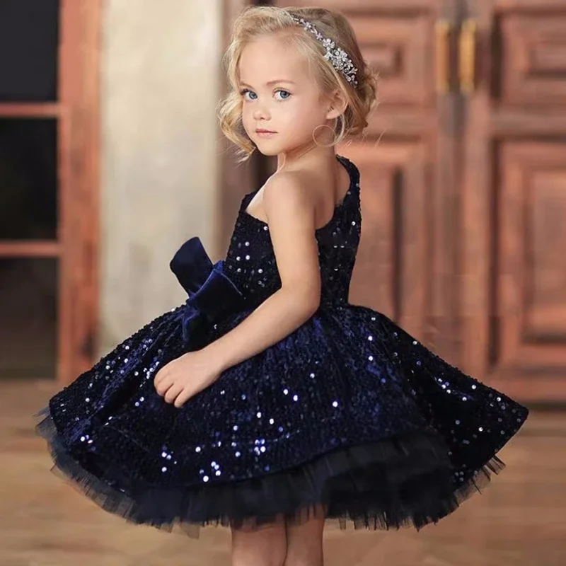 Vestido de tul azul marino con lentejuelas y lazo, de un solo hombro, para boda, fiesta de cumpleaños, comunión, personalizado, para niña de las flores