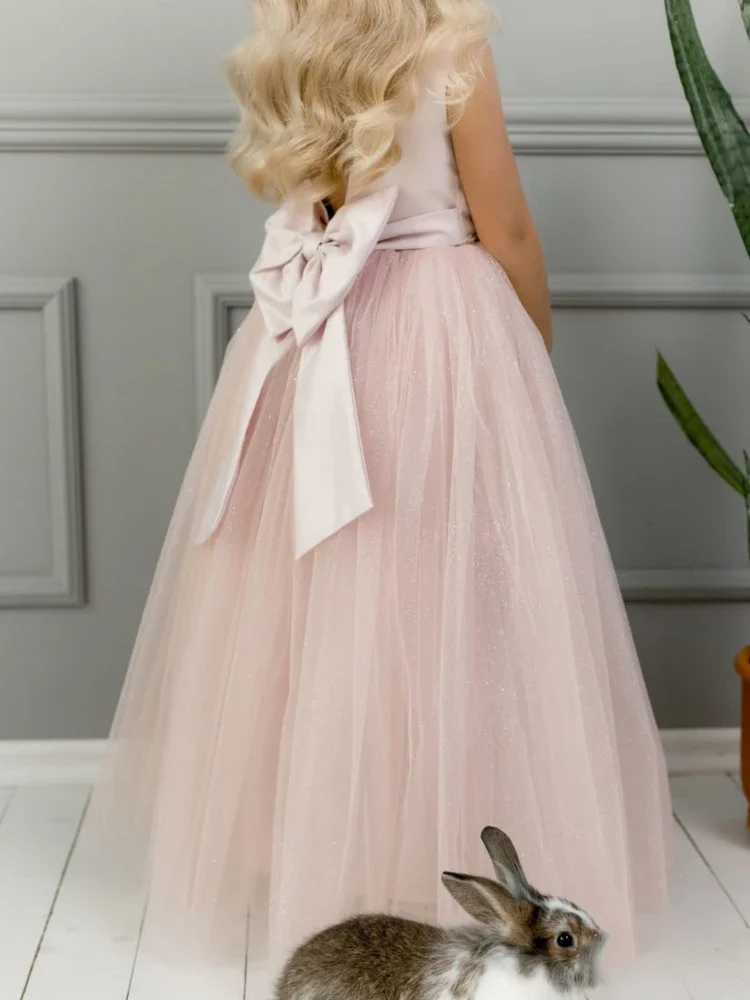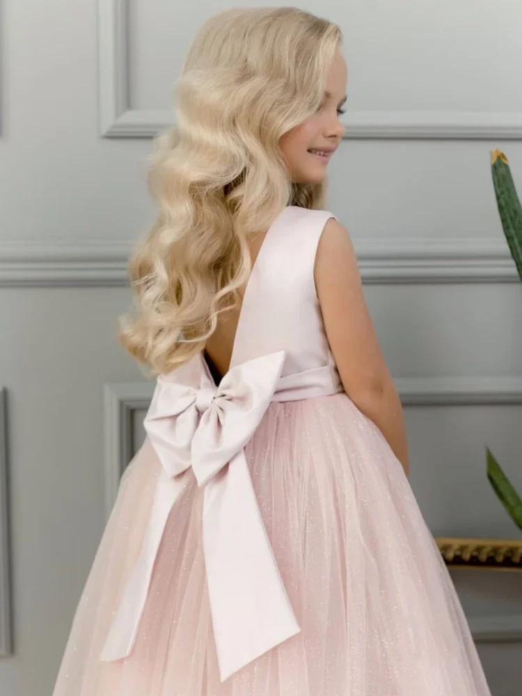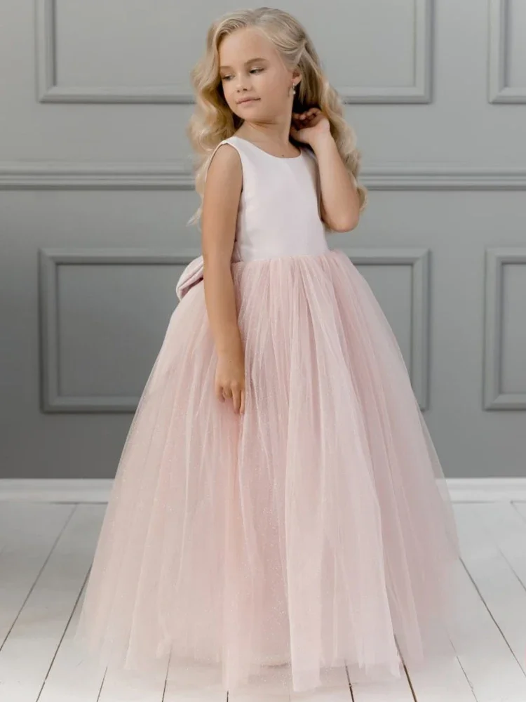 Vestido de tul de satén rosa con lazo sin mangas para boda, fiesta de cumpleaños, primera comunión, fiesta de niñas, vestidos de niña de las flores