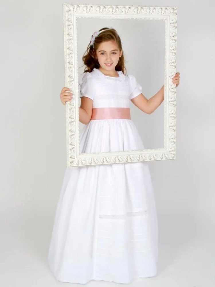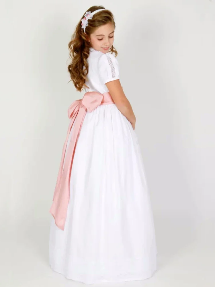 Vestido de princesa para niña de las flores, de satén blanco con encaje y lazo rosa, de manga corta, para bodas, fiestas de cumpleaños y banquetes.