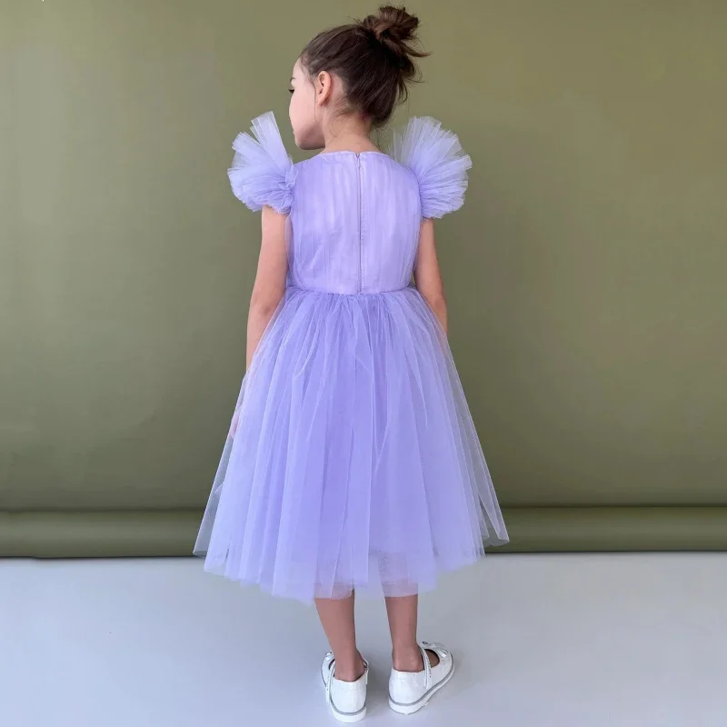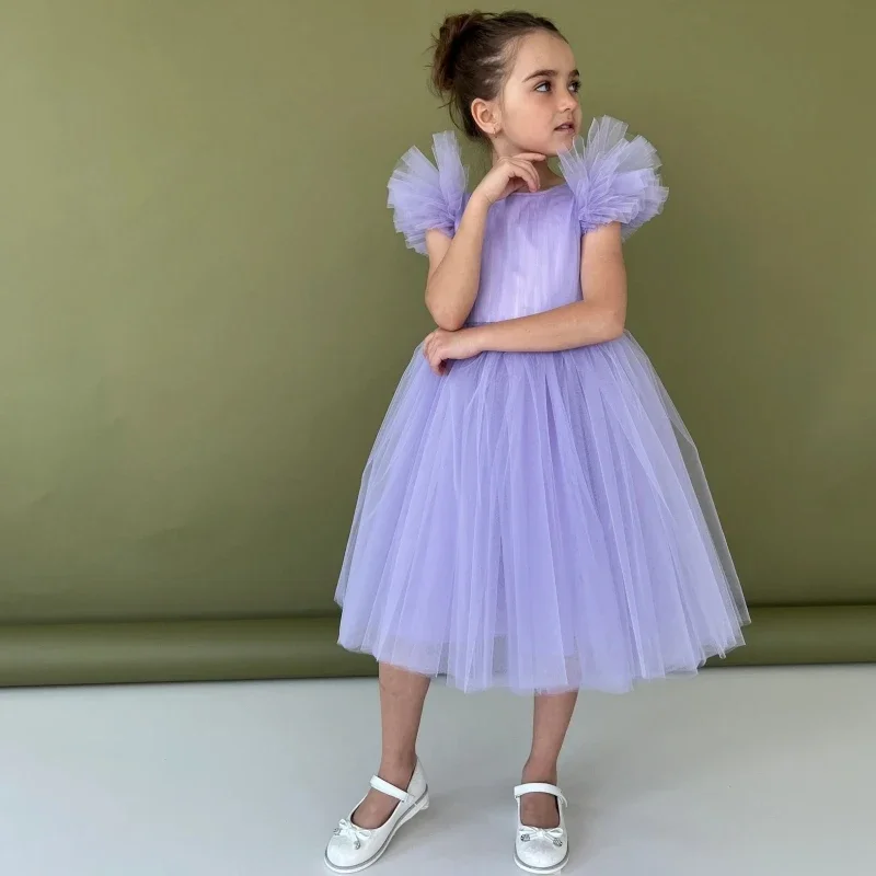Vestidos de tul morado con mangas cortas y cremallera para bodas, fiestas de cumpleaños, banquetes, comuniones y niñas de las flores.