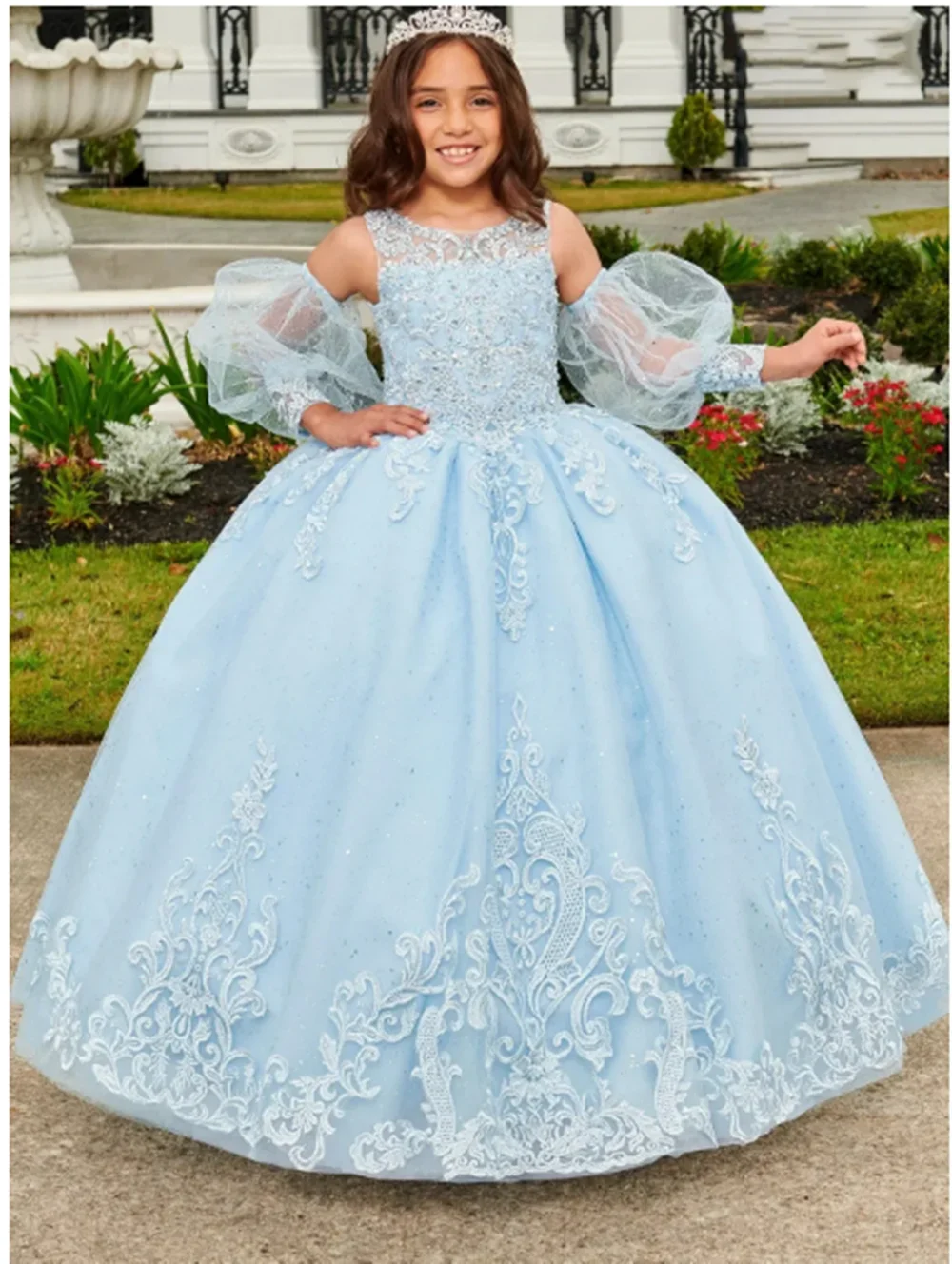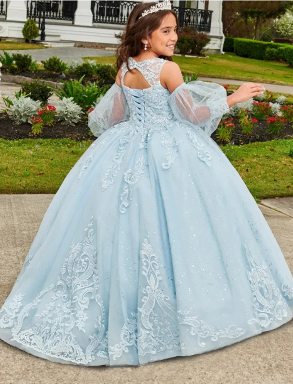 Vestido elegante de lentejuelas hasta el suelo para niña, fiesta de cumpleaños, primera comunión, apliques de encaje, vestidos de niña de las flores para boda