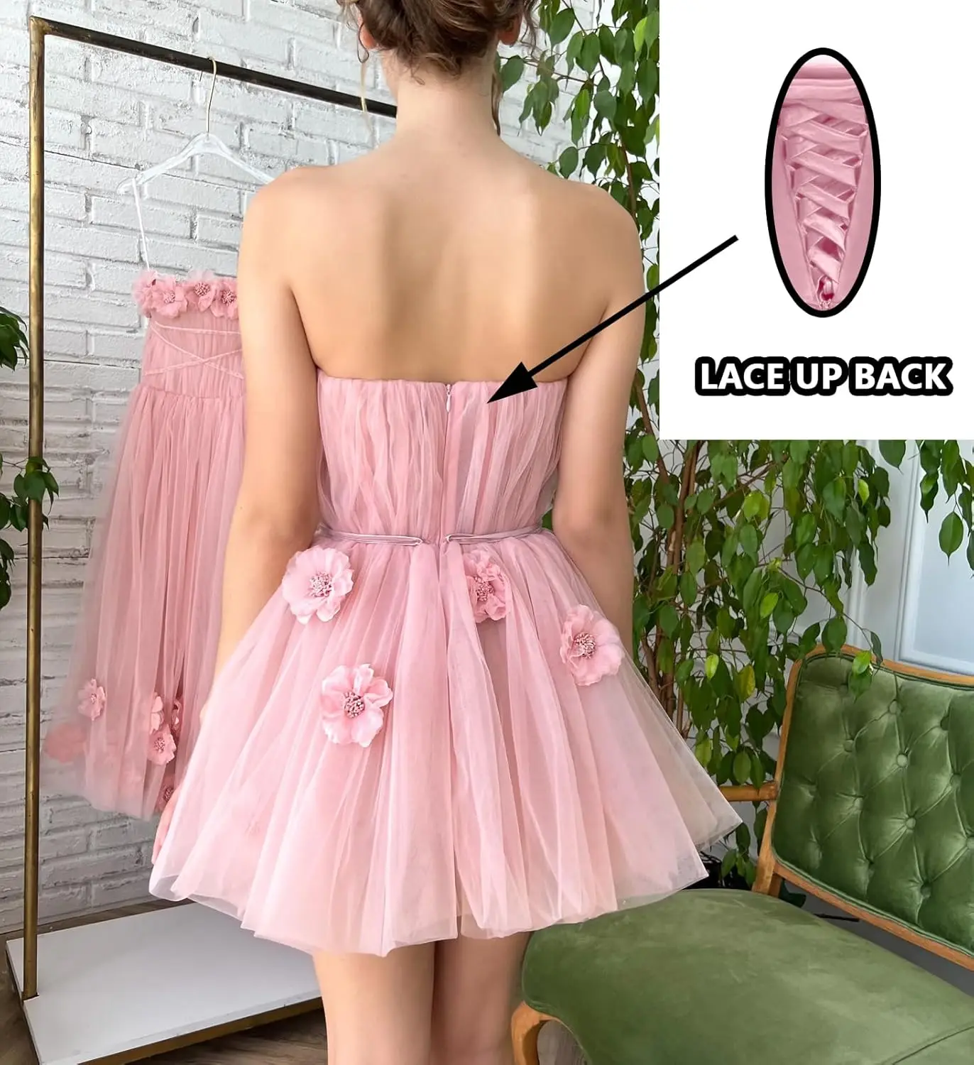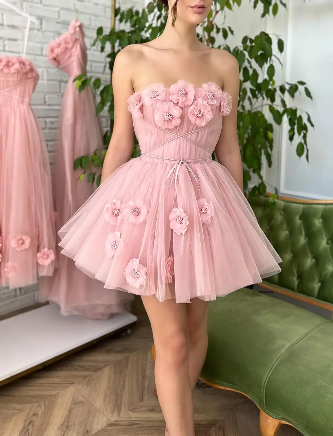 Vestido de cóctel corto de tul sin tirantes, floral, corte A, para adolescentes, personalizable, para fiesta, graduación, minivestido