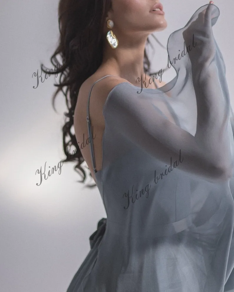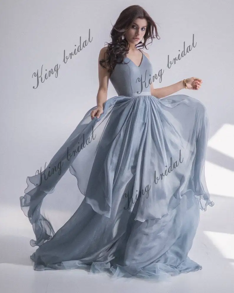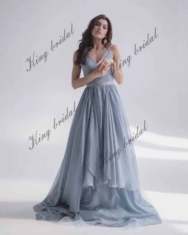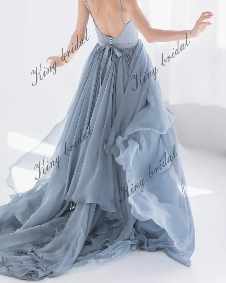Este elegante vestido de novia luce un top azul con escote en V y ballenas, con espalda abierta. El top ofrece una sujeción perfecta para el pecho. La falda, con cola larga, está compuesta por varias capas de seda, tul y gasa. Se cierra en la espalda con una cremallera oculta, botones y un pequeño y elegante lazo.