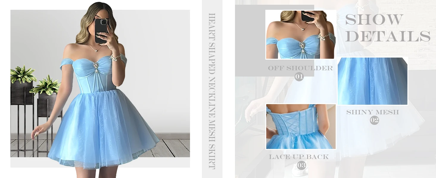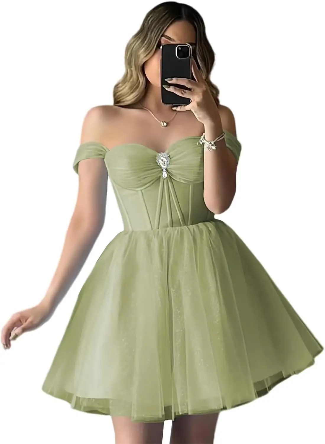 Vestidos de fiesta de tul brillante con hombros descubiertos, vestidos de fiesta cortos para adolescentes, vestido de cóctel de corte A con escote en forma de corazón y vuelo.