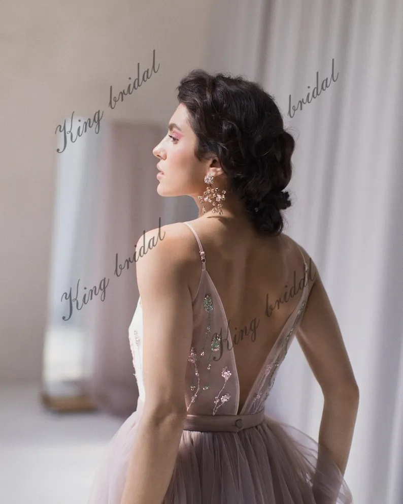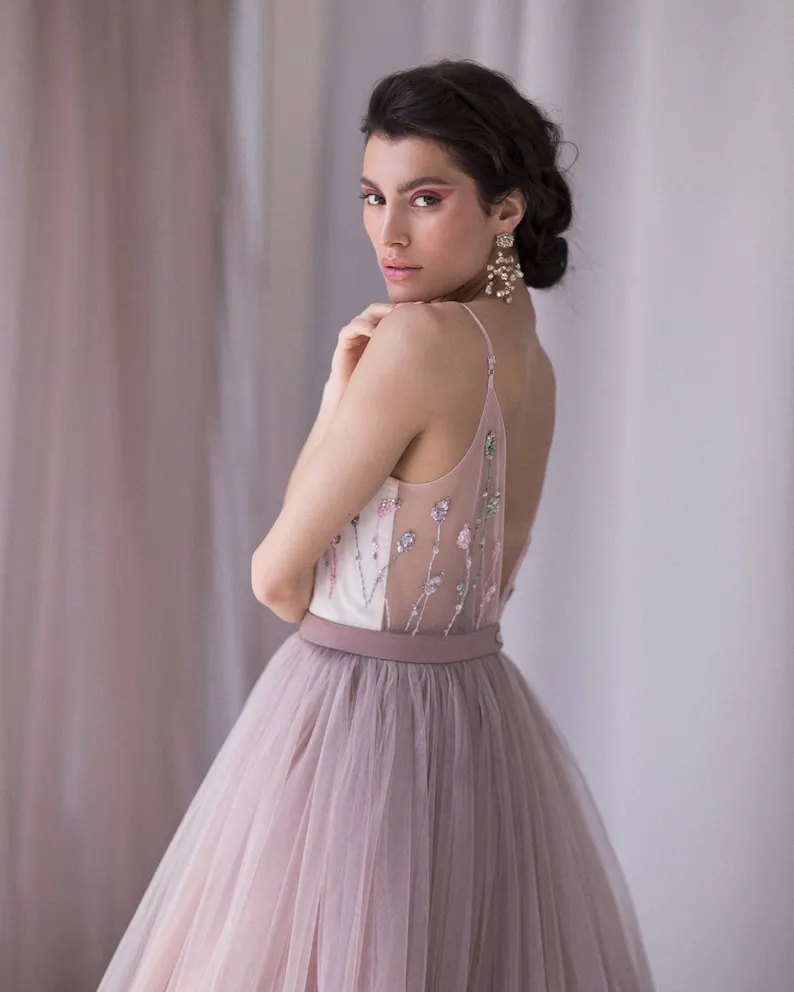 Vestido de novia con escote en V, espalda halter con cuentas y capas de tul. Vestido de novia no tradicional. Vestido de novia en color rubor pálido con flores de colores.
