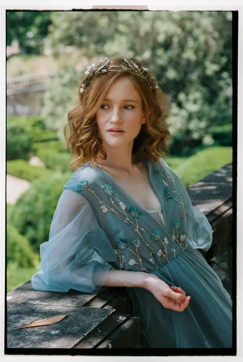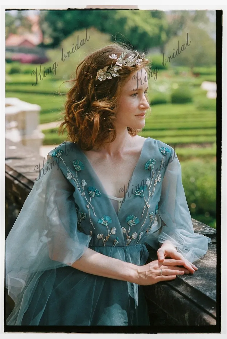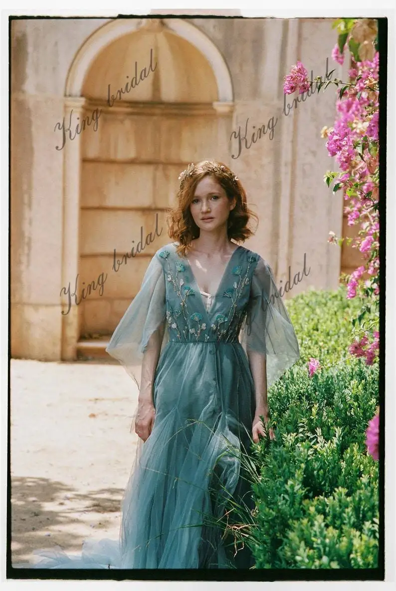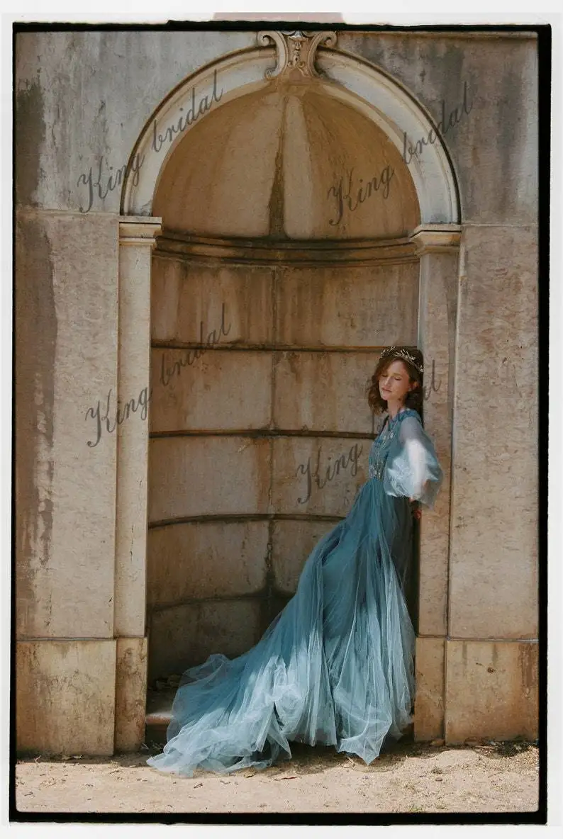 Vestido de novia de tul voluminoso con mangas azul pálido, vestido formal bordado a mano de hada para mujer, elegantes vestidos de fiesta de noche