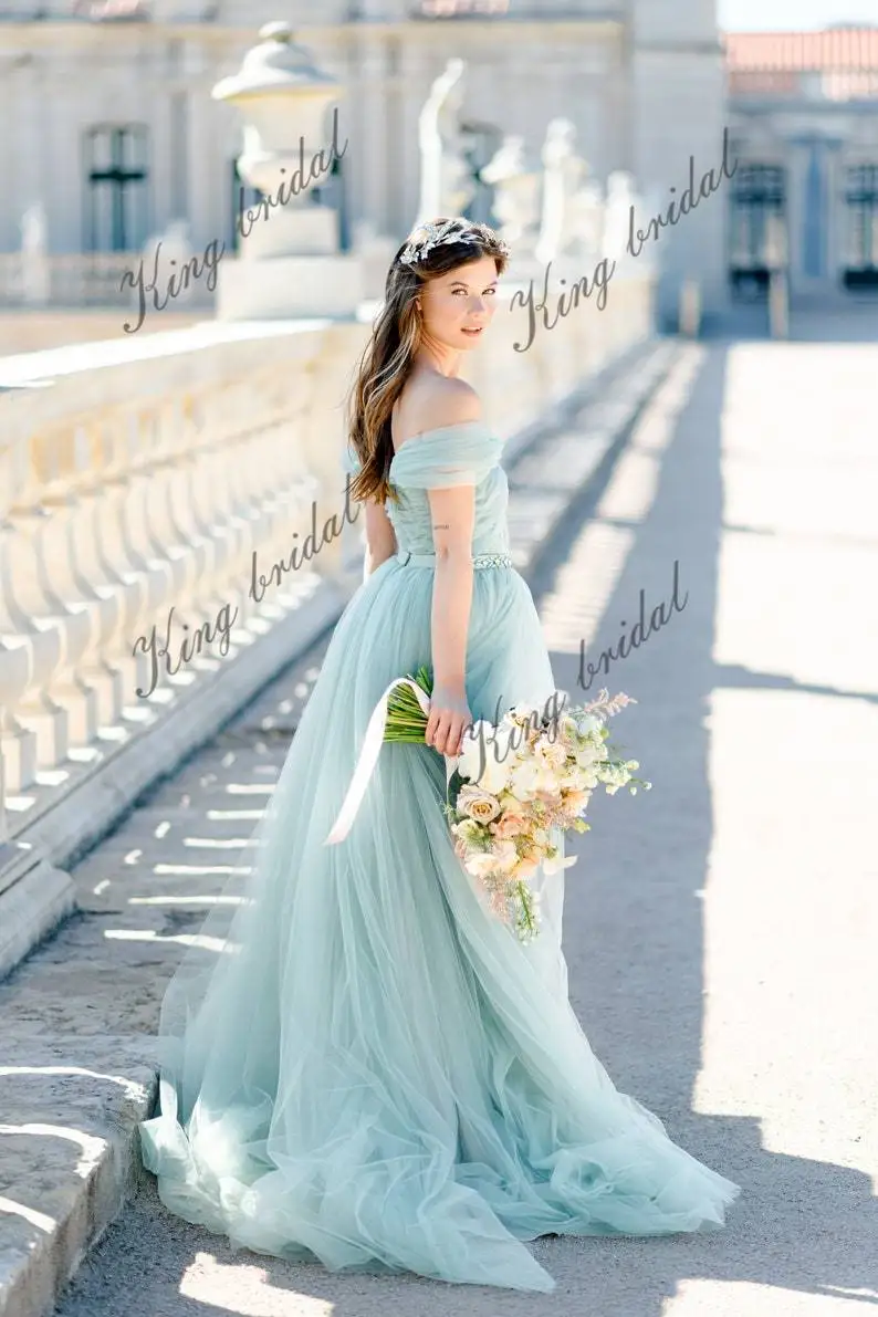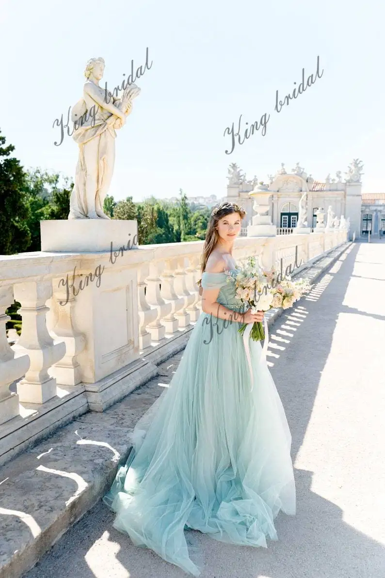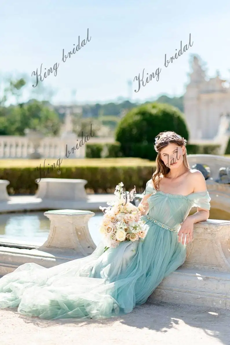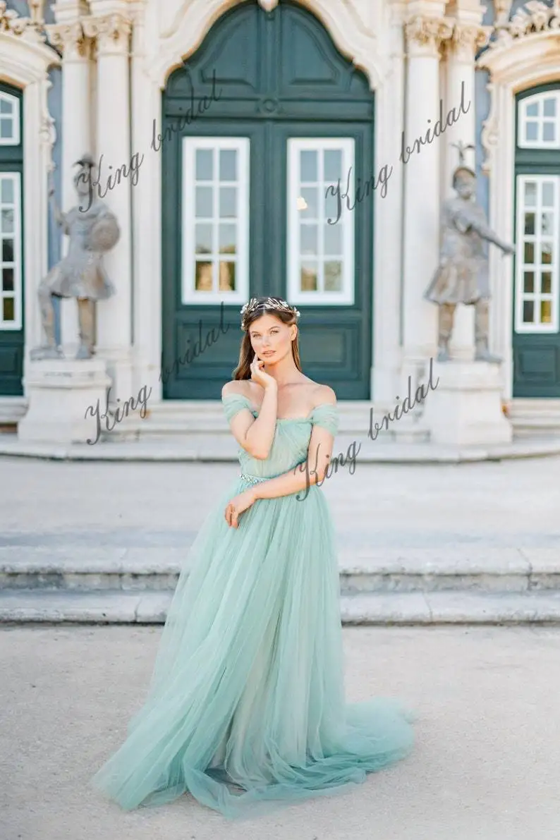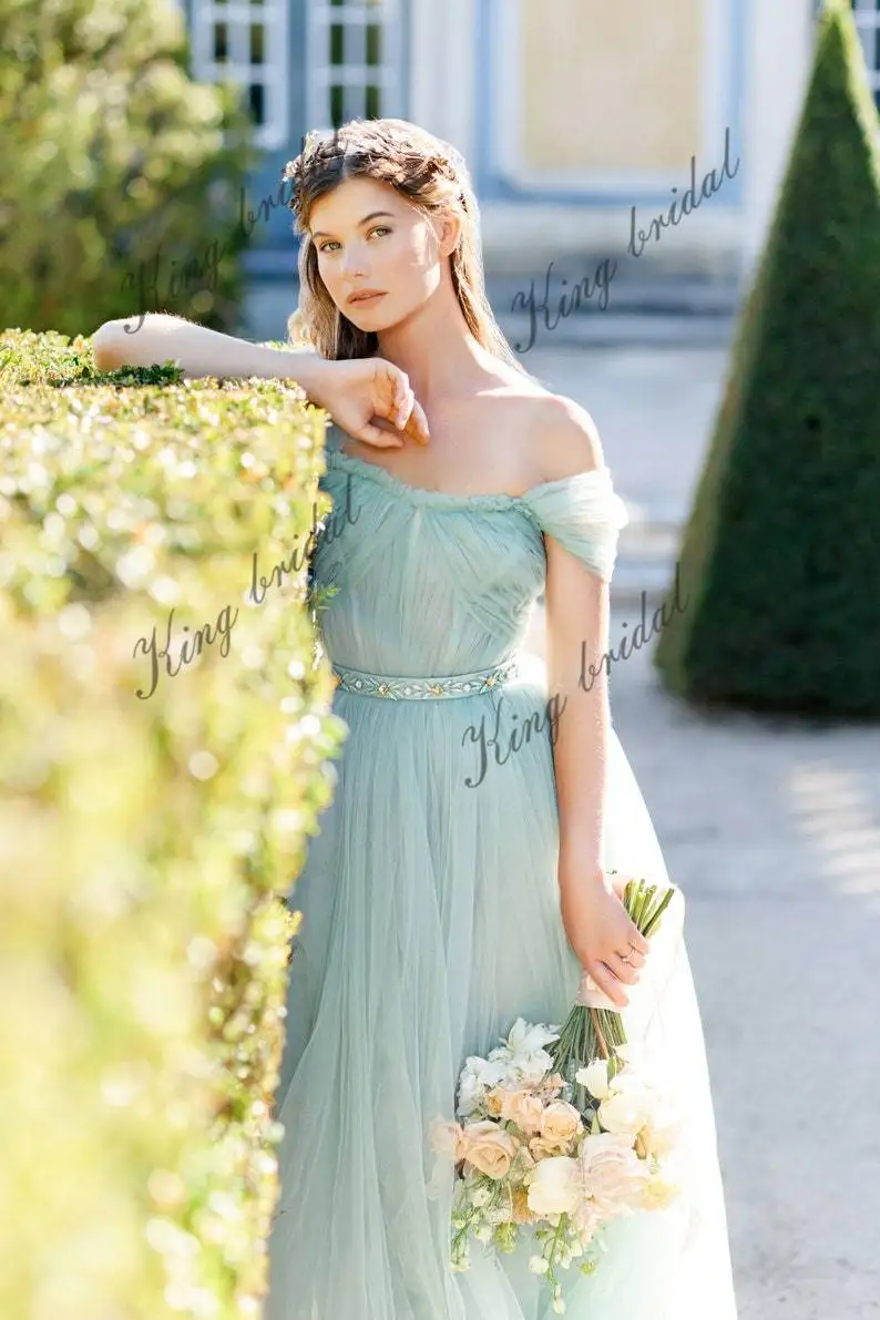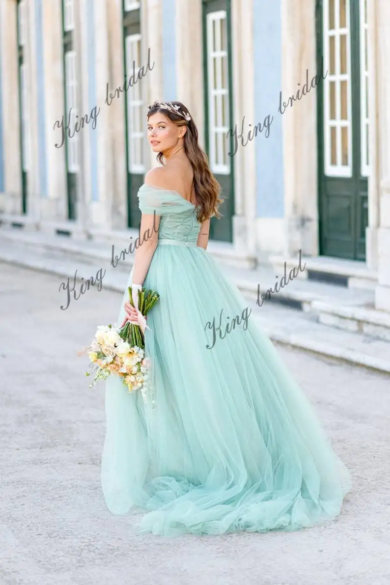 Luce un estilo único el día de tu boda con nuestro impresionante vestido de novia verde menta pastel con hombros descubiertos. El delicado corsé de tul drapeado irradia romance y elegancia, mientras que el escote resalta tus clavículas. La falda fluida y amplia crea una silueta elegante y etérea, permitiéndote bailar toda la noche con naturalidad y gracia. Para realzar su encanto, este vestido presenta un exquisito bordado de cristales en la cintura, que añade un toque de brillo y glamour a tu conjunto nupcial. Meticulosamente elaborado a mano con sumo cuidado y atención al detalle, este vestido de novia verde pálido con hombros descubiertos está diseñado para hacerte sentir como una verdadera diosa en tu día especial.
