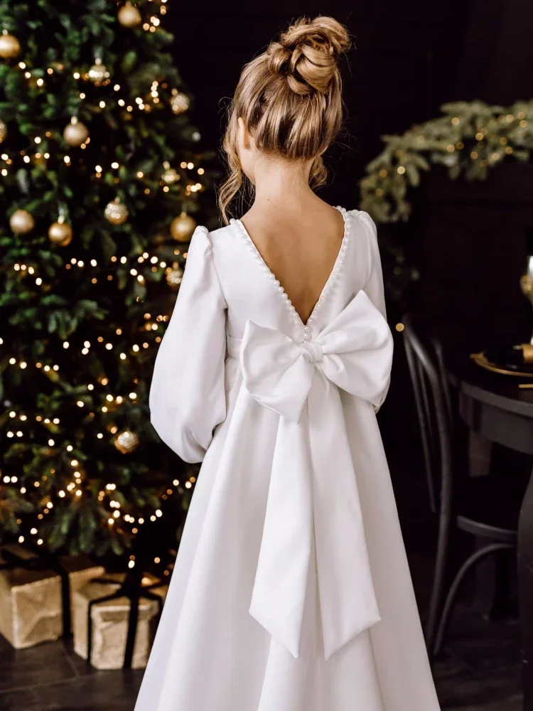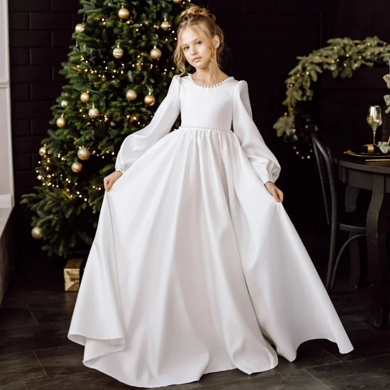 Vestidos de satén blanco con cuello de perlas y lazo, manga larga, para bodas, cumpleaños, banquetes, comunión, personalizados, para niñas de las flores.