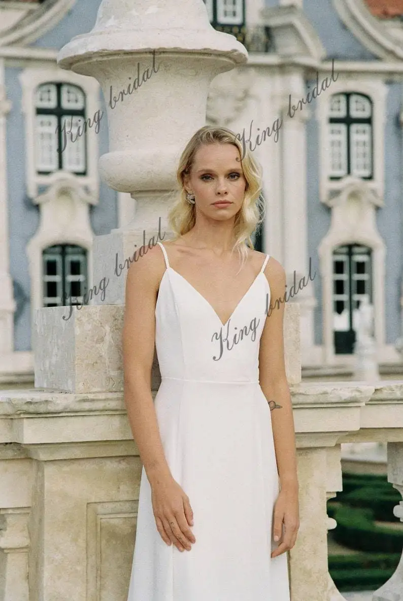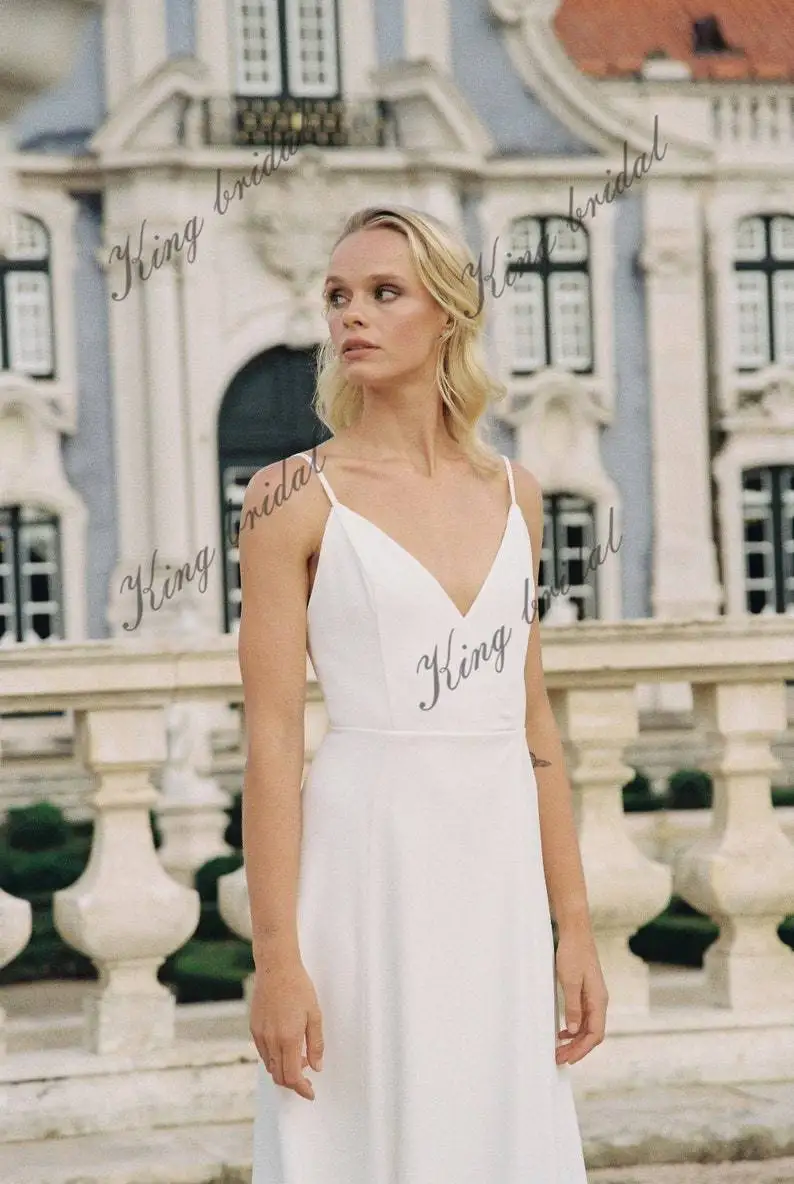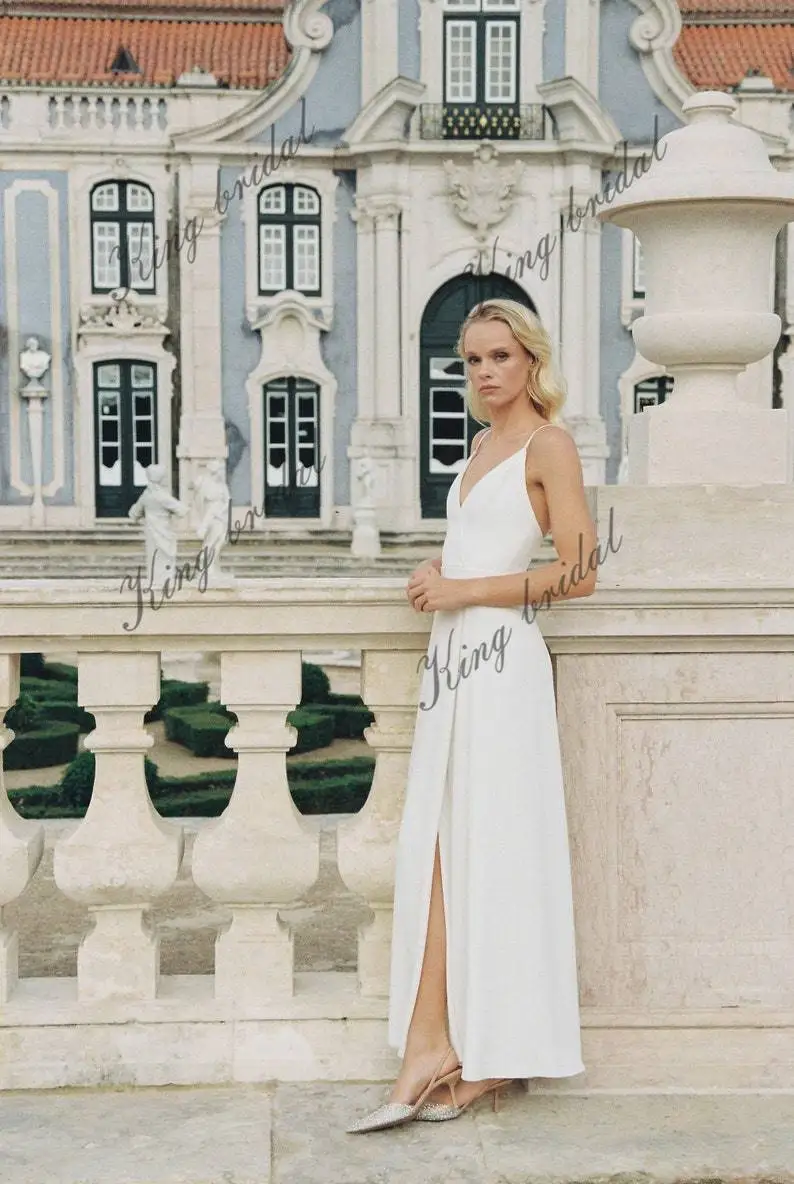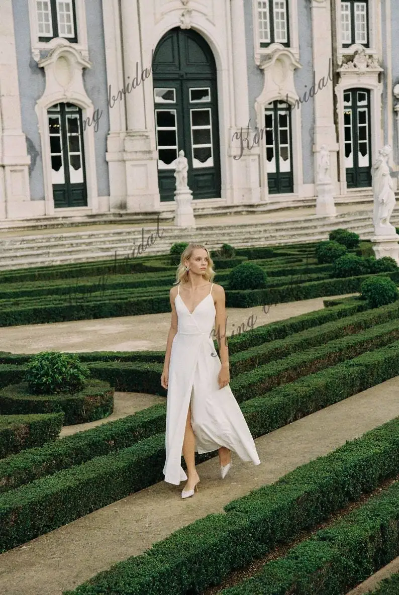 Nuestro vestido de novia cruzado con delicados tirantes finos. La doble capa del vestido garantiza un aspecto opaco, mientras que su silueta cruzada se adapta a diferentes tipos de cuerpo. La abertura frontal en la falda añade un toque de encanto, realzando tus piernas con tus elegantes movimientos. Confeccionado en crepé de alta calidad, este vestido es ideal para la novia que busca un look sofisticado y sobrio, combinando comodidad y elegancia a la perfección.