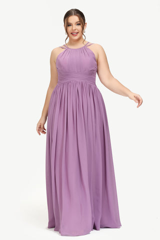 High neck halter matched with double spaghetti straps on the back. delicate pleated bodice and back. this body-skimming a-line dress is accented with an effortless flattering crisscross waistband. The ruching cascades down the full skirt. Graceful and Elegant.